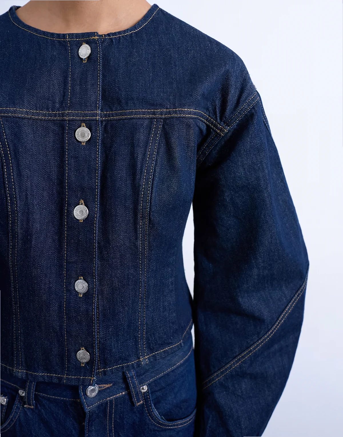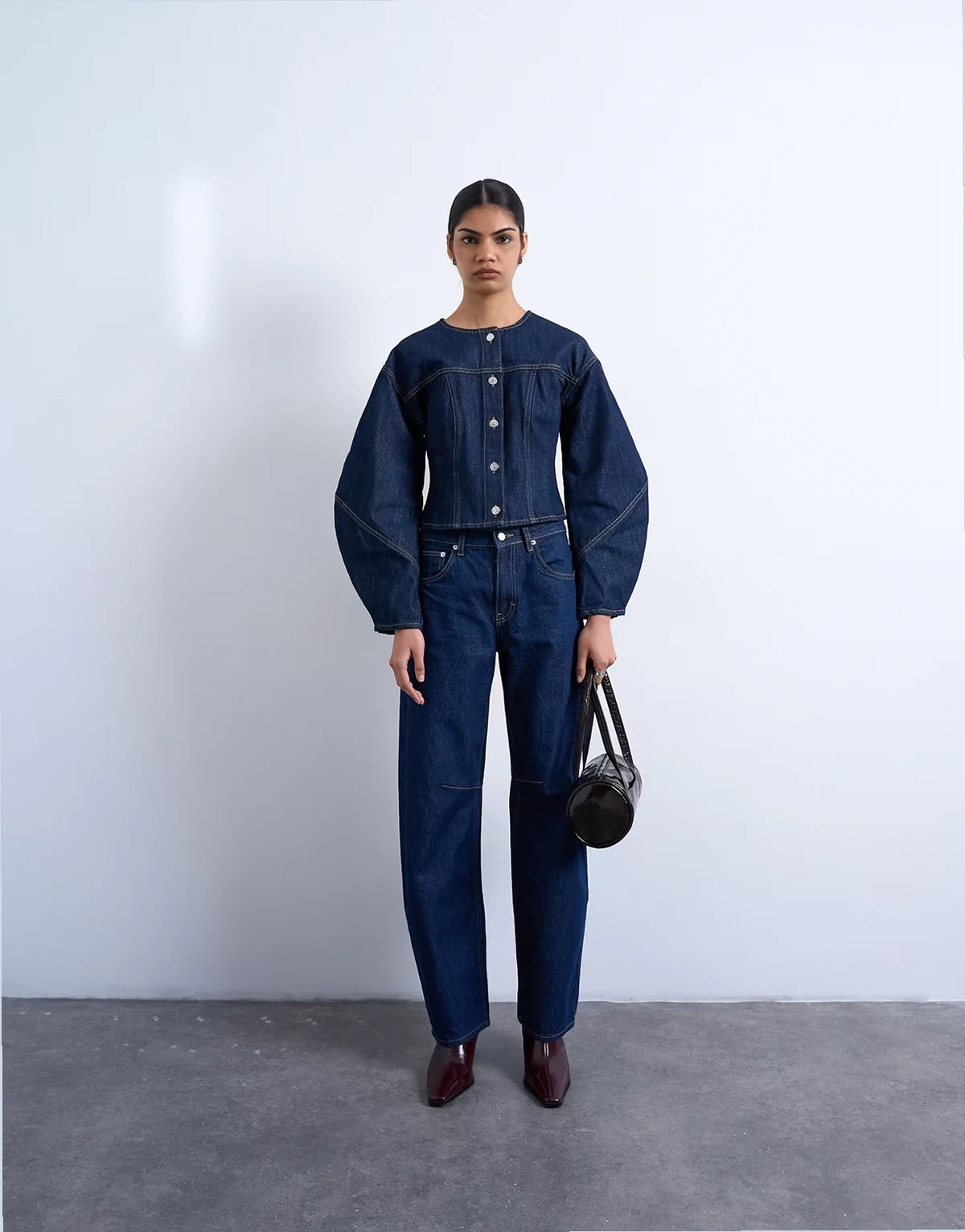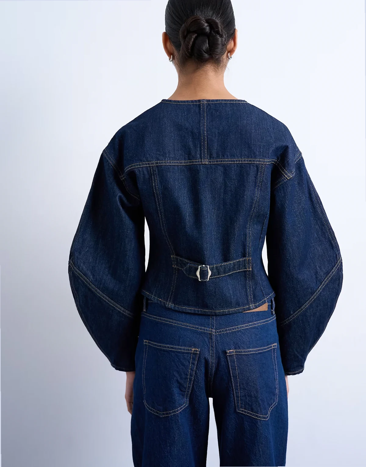 This structured style features a round neck, voluminous sleeves and a button placket. It is cut from lightweight, rigid denim. Cinch the waist using the adjustable back strap.
