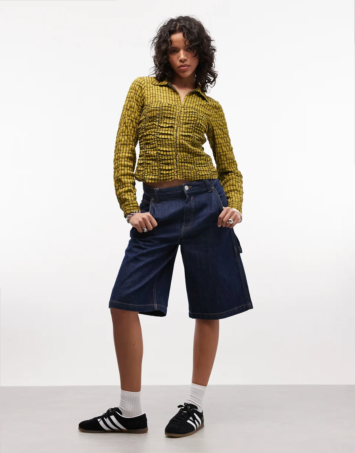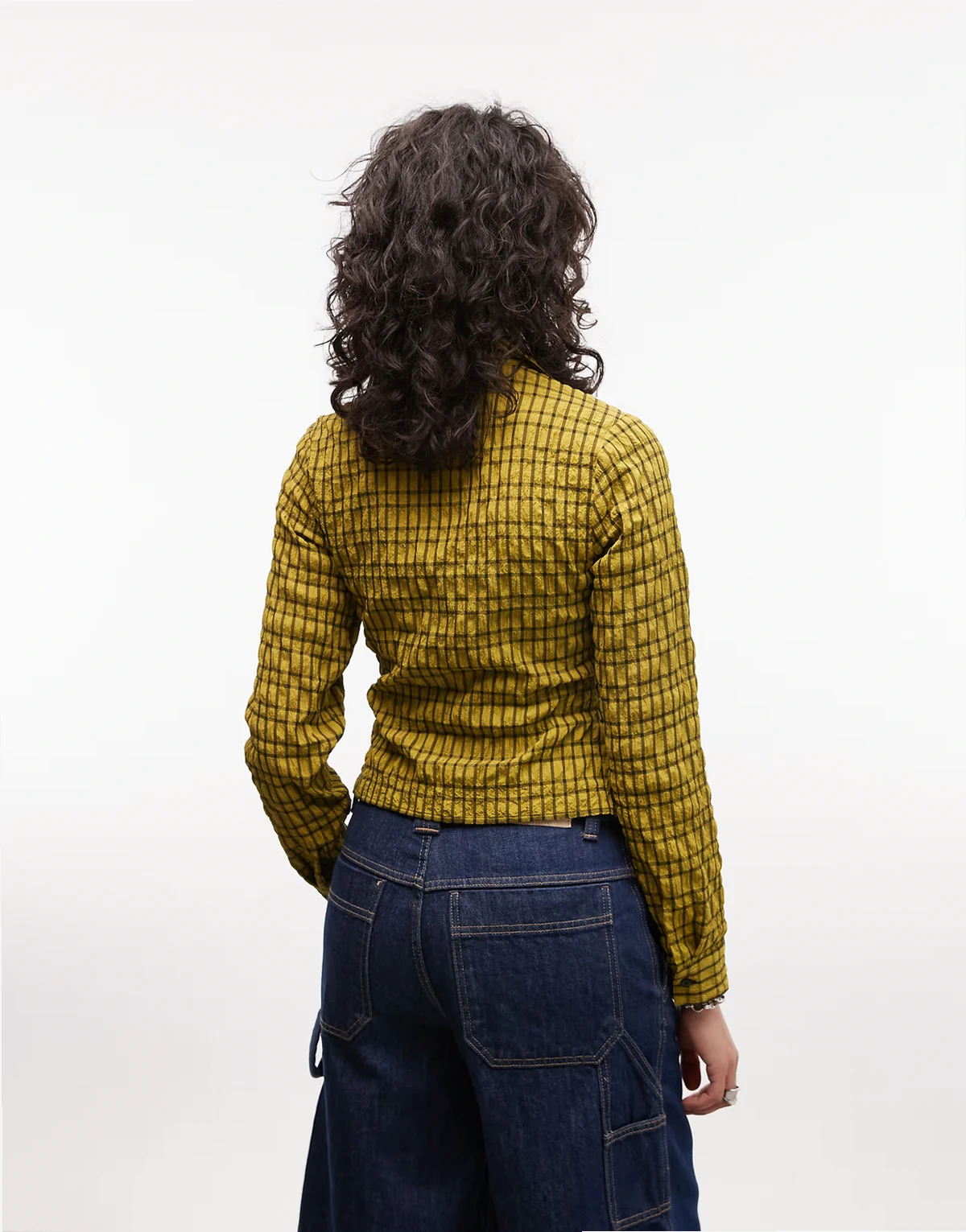shirred fitted shirt in green plaid