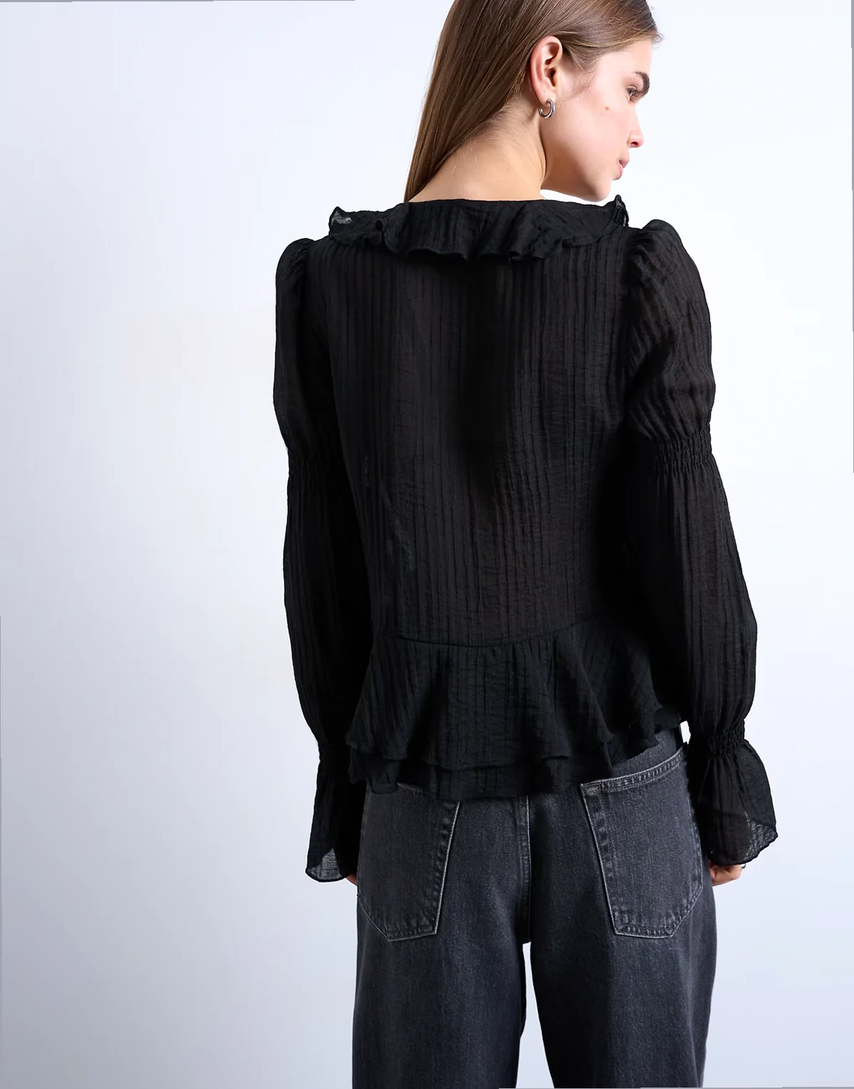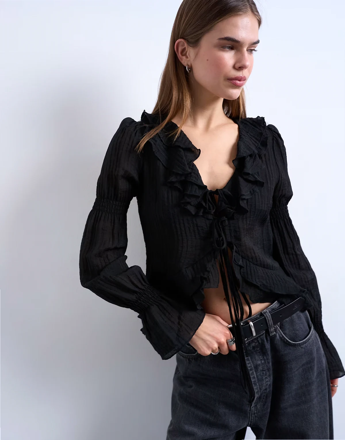 In sheer, floaty chiffon, this top features a V-neck, a tie front, fluted sleeves and elegantly frilled trims.