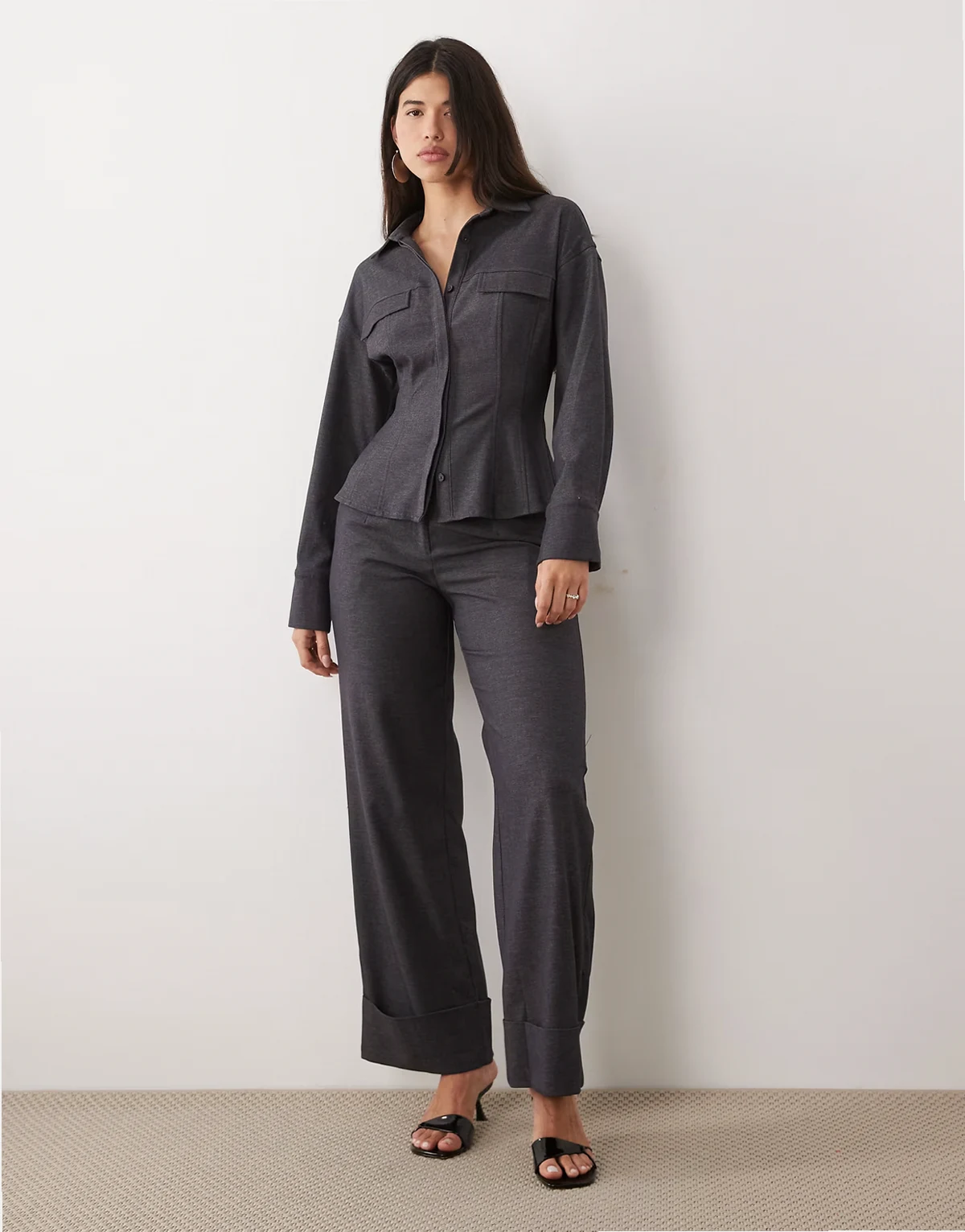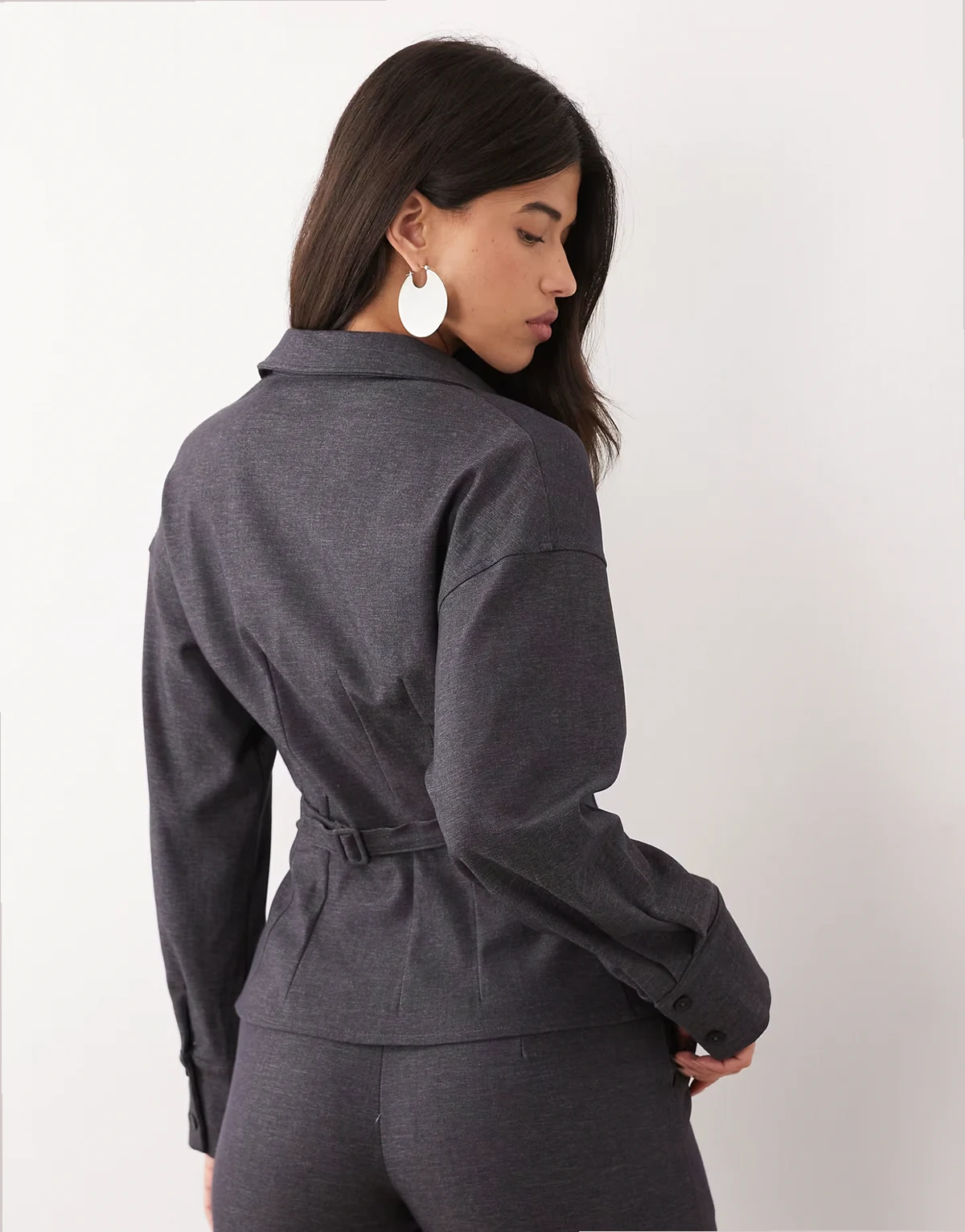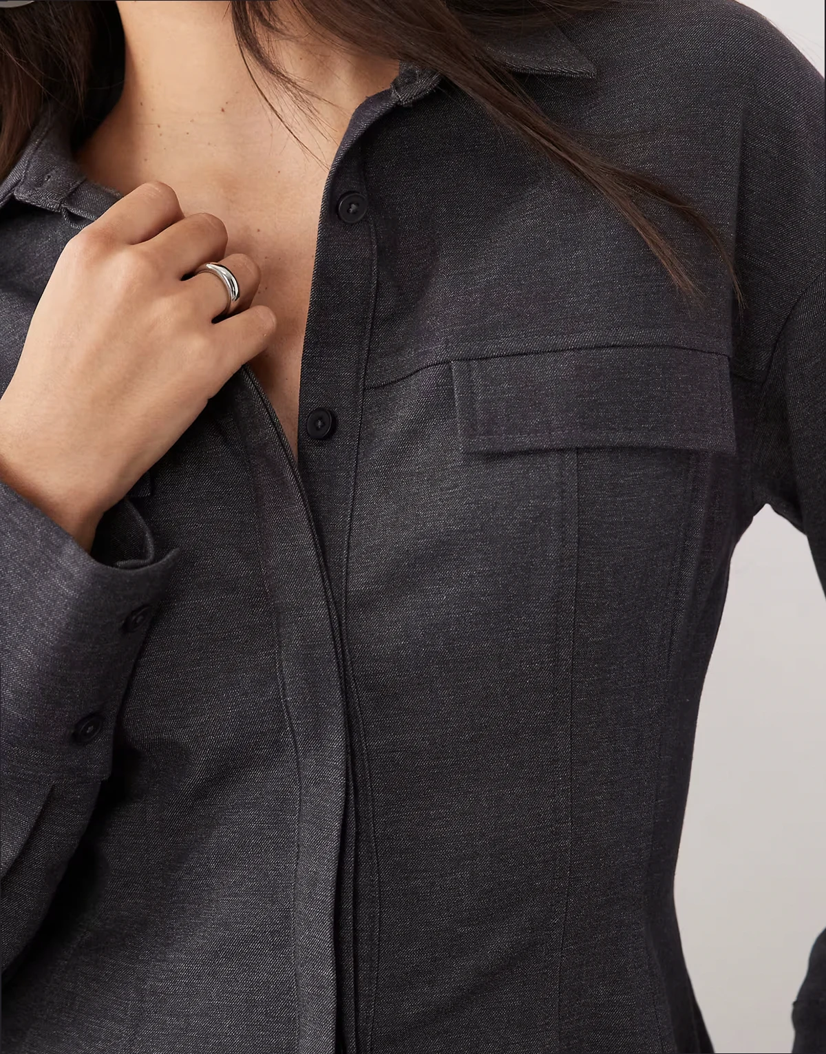 exclusive woven cinched waist seam detailing tailored stretch shirt in charcoal - part of a set
