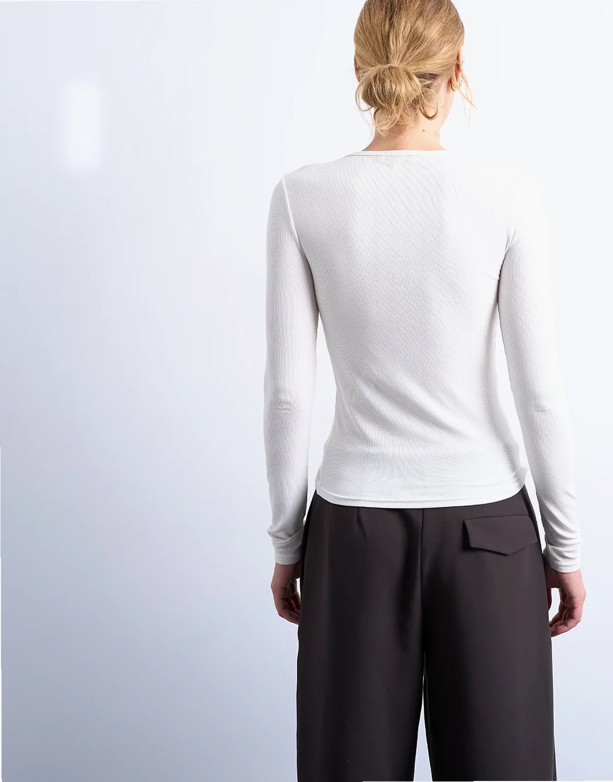 This top is crafted from soft, stretchy jersey with a fine ribbed finish. It Features a crew neck and long sleeves, this style is cut to a slim fit.