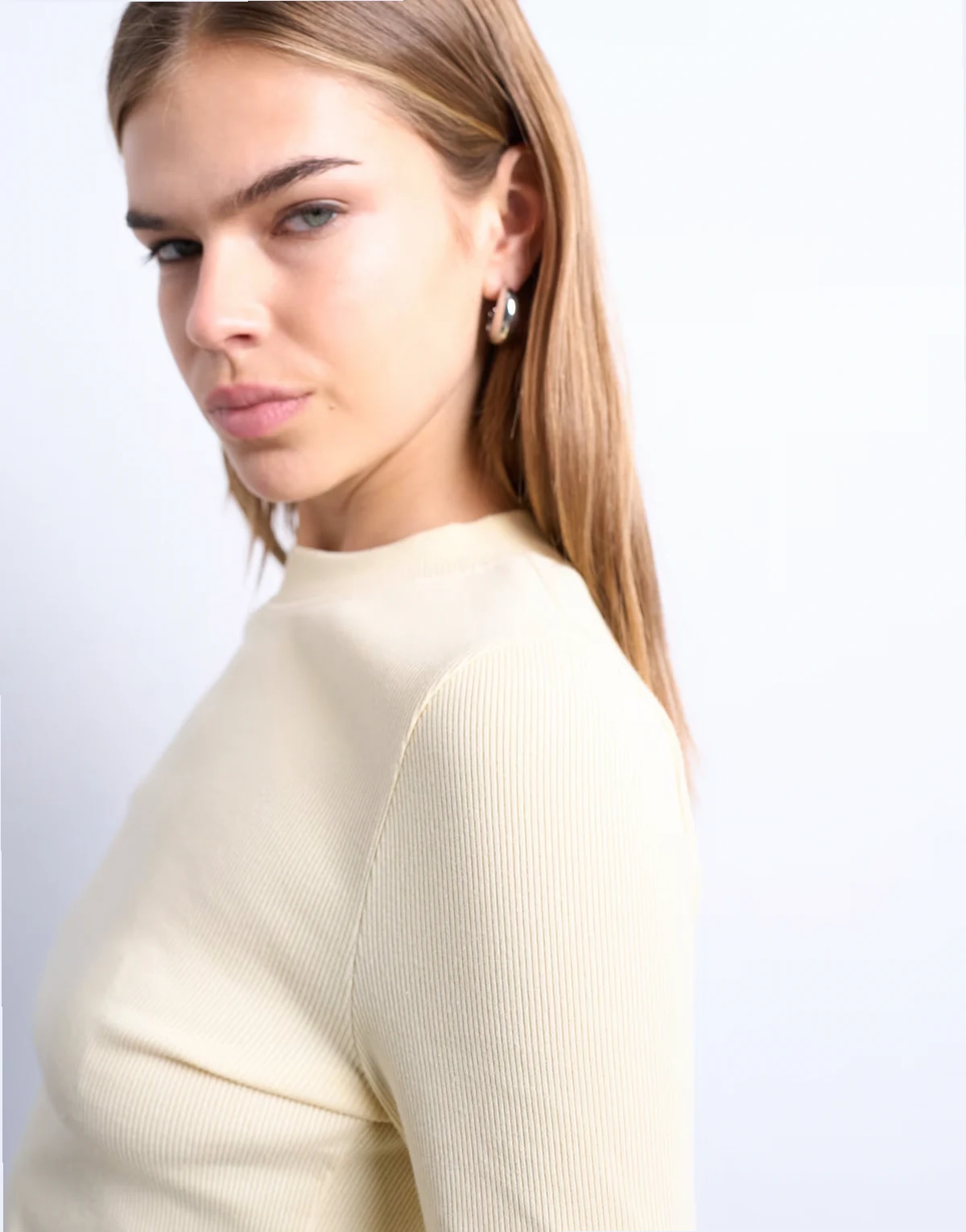 This top is crafted from soft, stretchy jersey with a ribbed texture. It features a crew neck, long sleeves, curved hem and a slim fit.