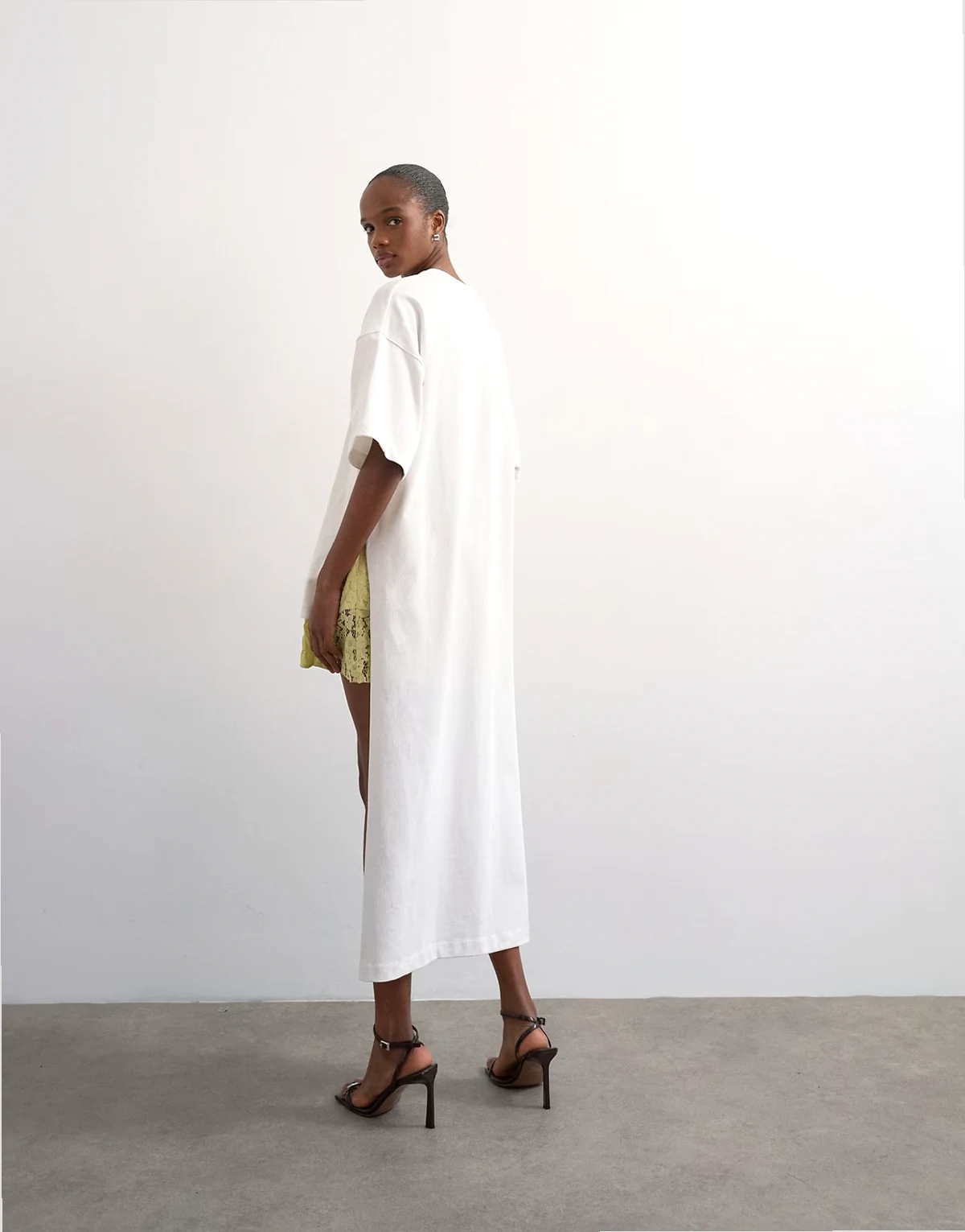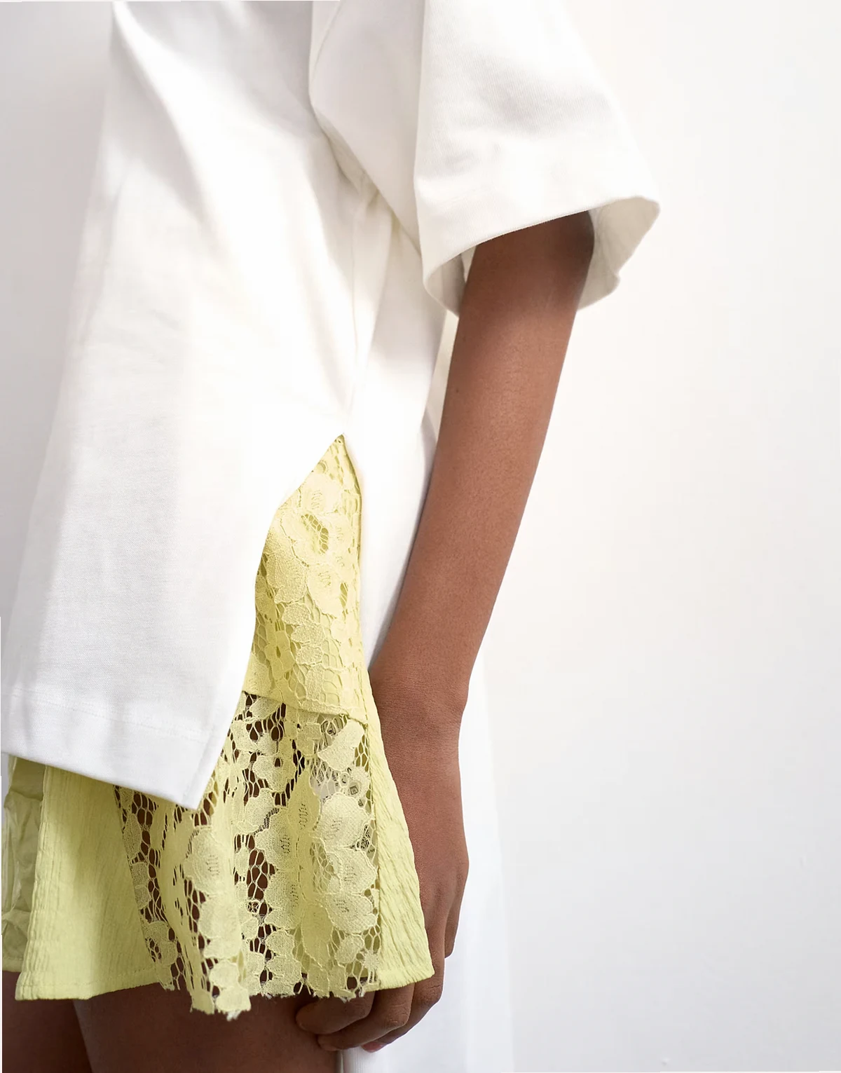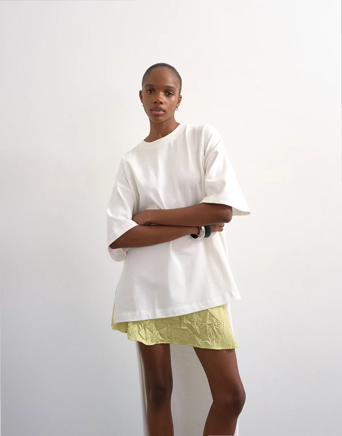 This T-shirt is crafted from a jersey fabric in a plain design. It features a crew neck, shorts sleeves and high-low hem. It is cut with an oversized fit.