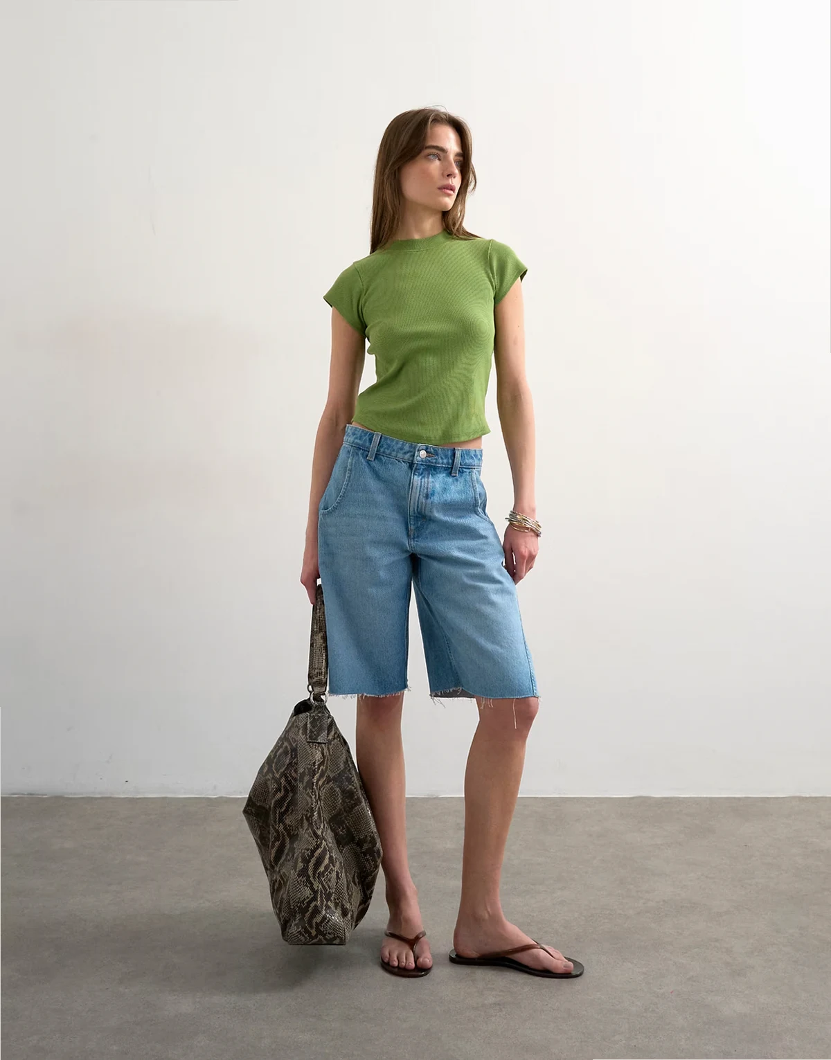 This T-shirt is crafted from ribbed jersey in a green shade. It features a crew neck, cap sleeves and a curved hem on a slim fit.
