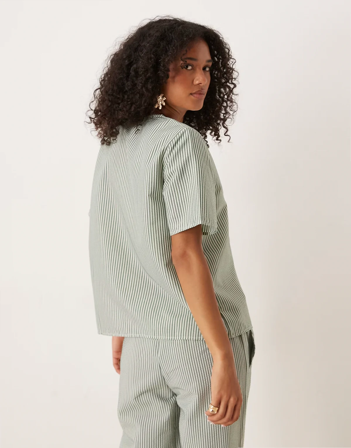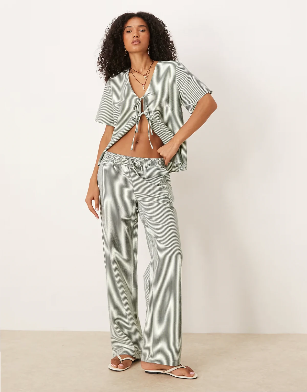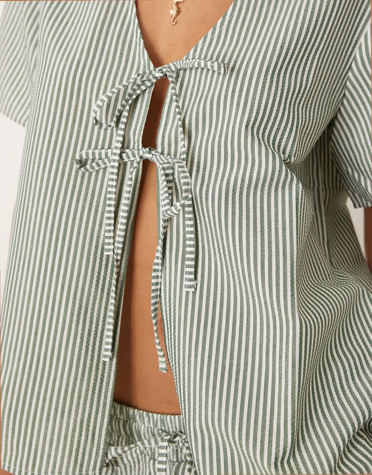 tie front seersucker top in green stripes - part of a set
