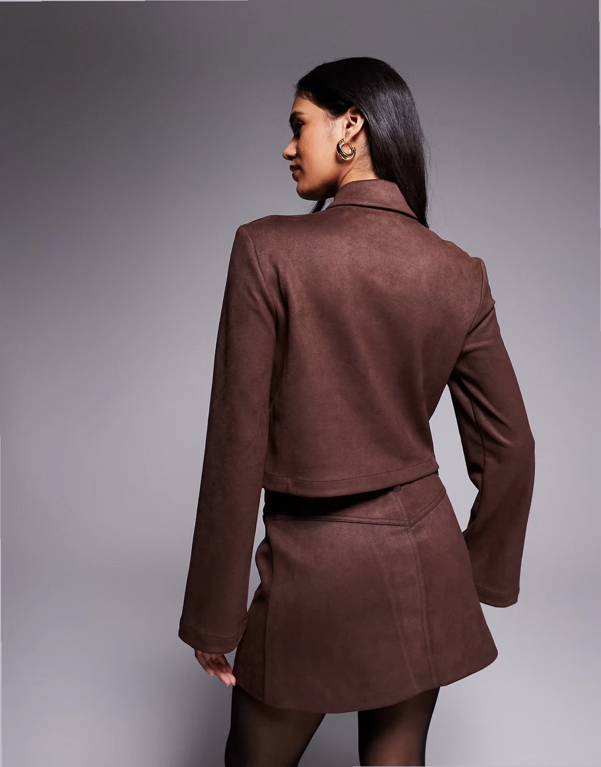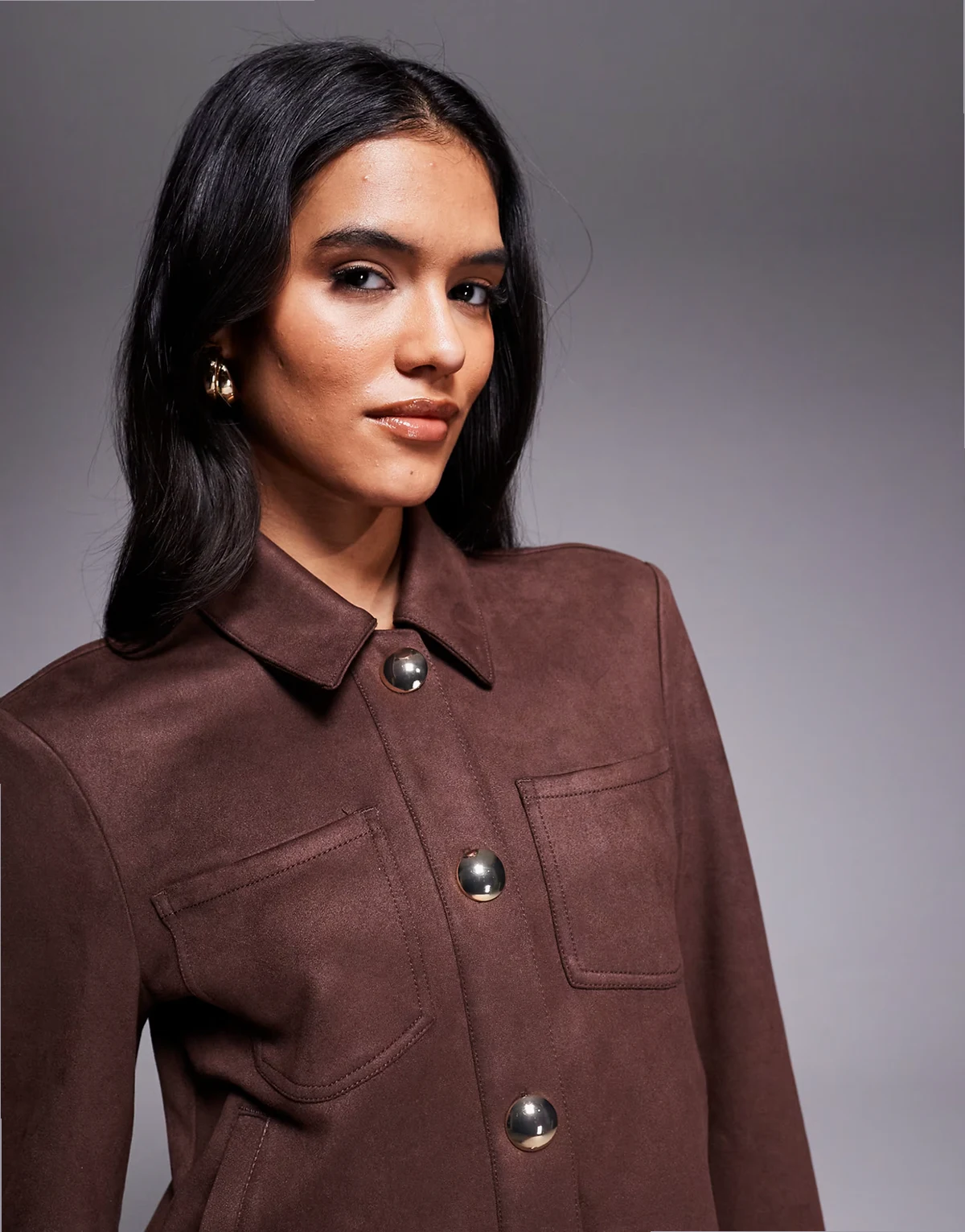 Lorenzo faux suede button front shacket in chocolate - part of a set