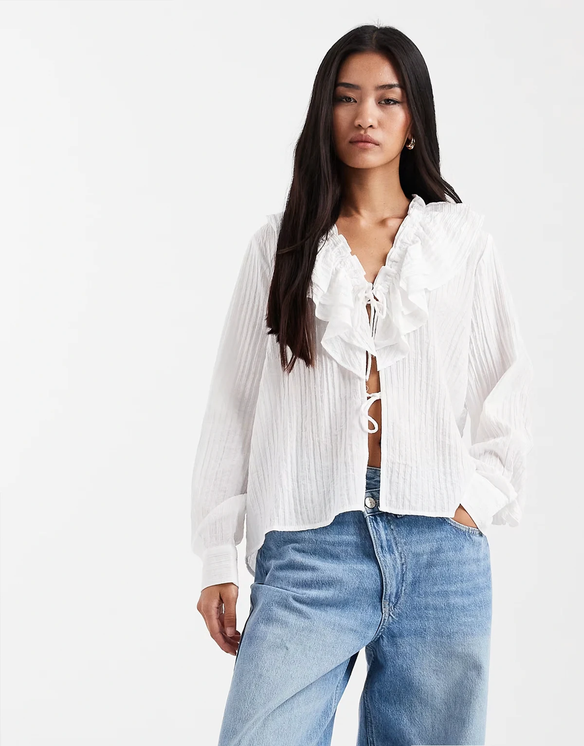 tie front ruffle neck boho blouse in white