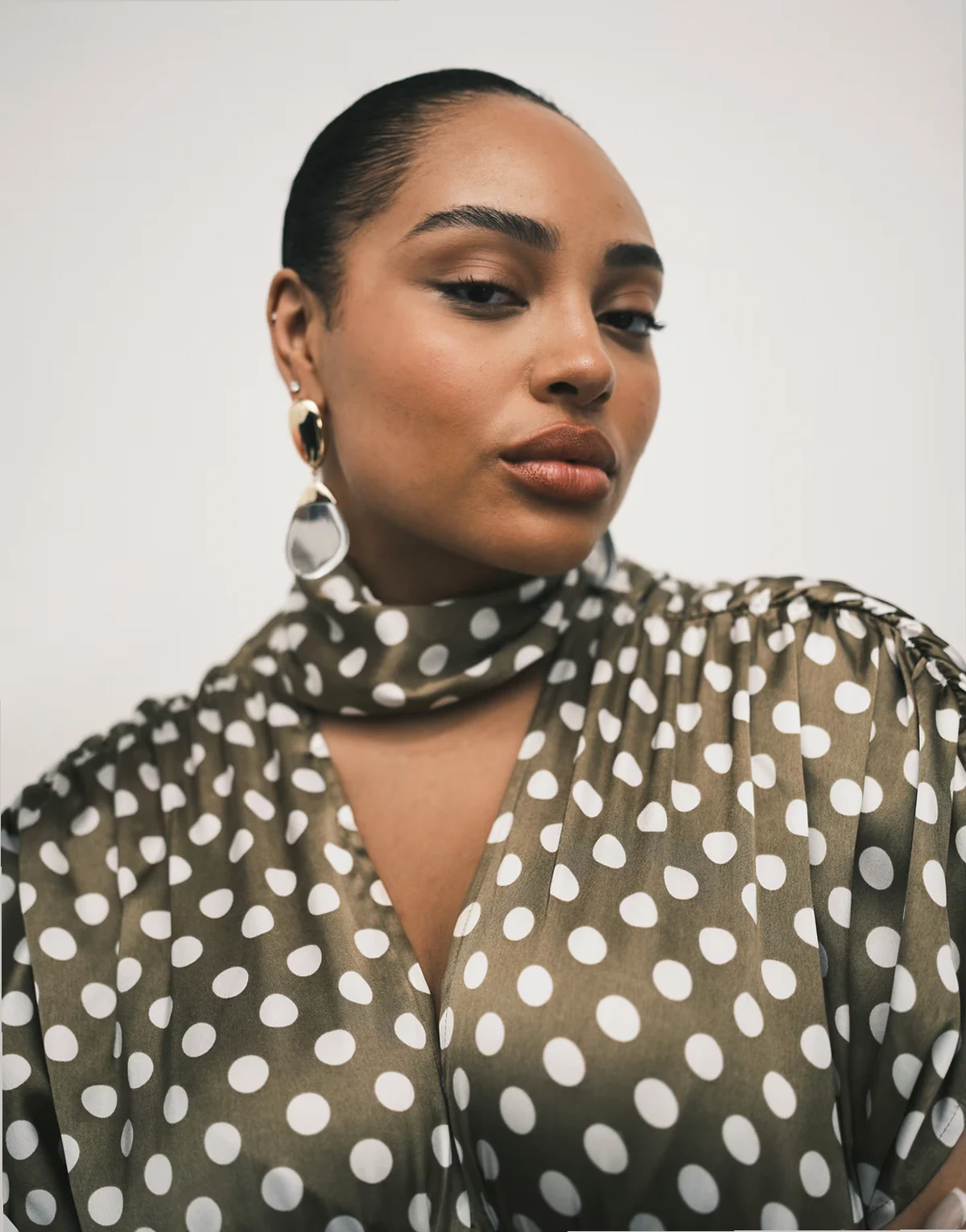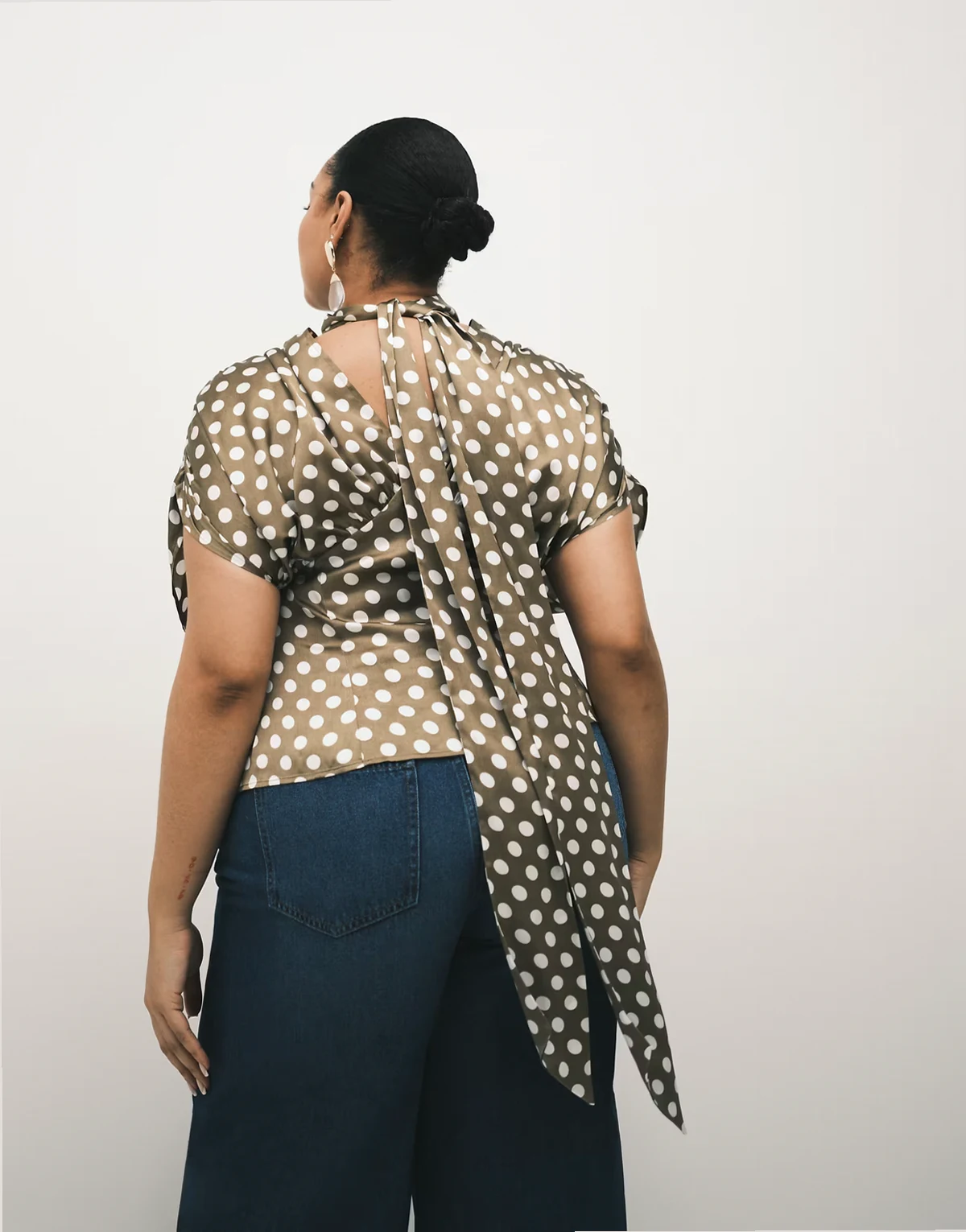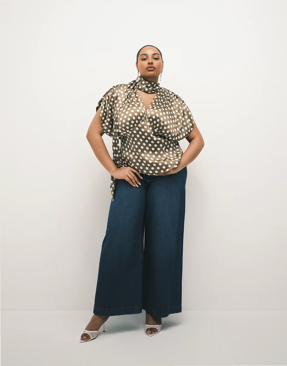 ASOS DESIGN Curve satin scarf and volume detail blouse in polka dot