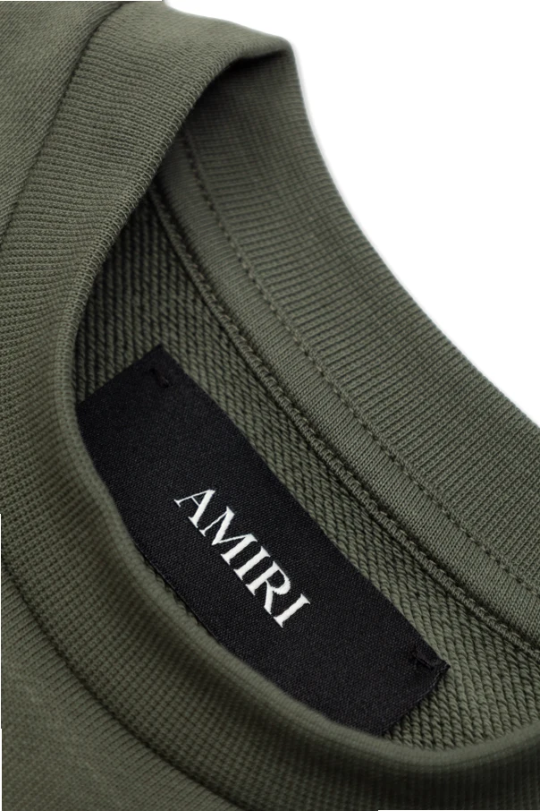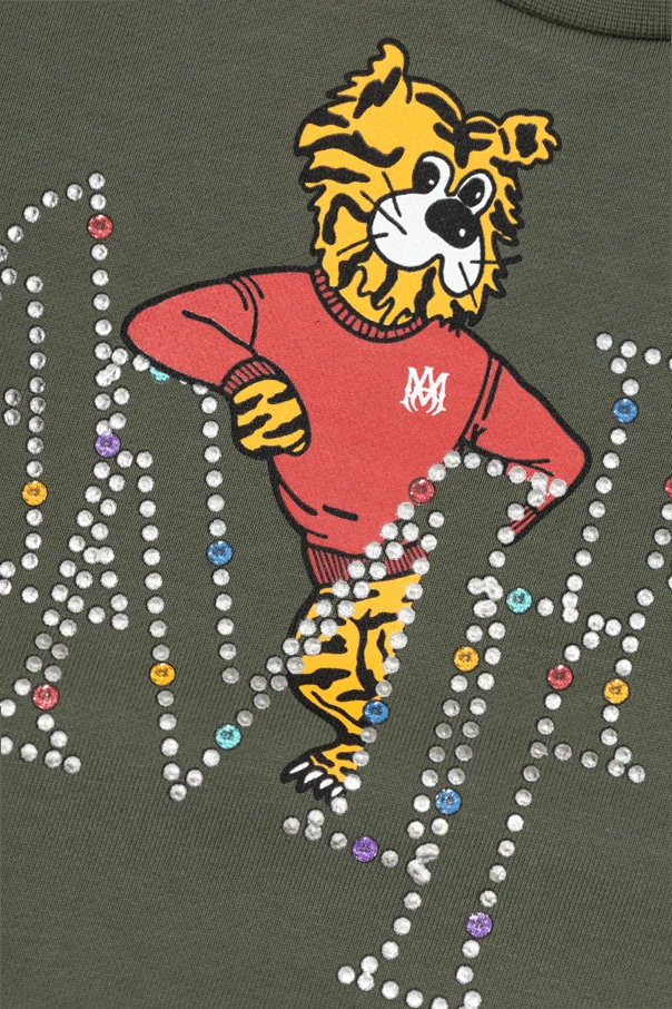 The lavish front showcases an opulent interpretation of the AMIRI logo, accentuated by shimmering rhinestone embellishments in varied hues. A playful cartoon tiger motif, stylish in a vivid red sweatshirt, adds a spirited, youthful twist, making each piece truly distinctive. A discreet designer label at the neckline underscores the exclusive character of the garment.