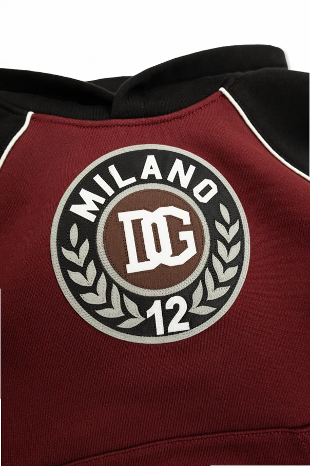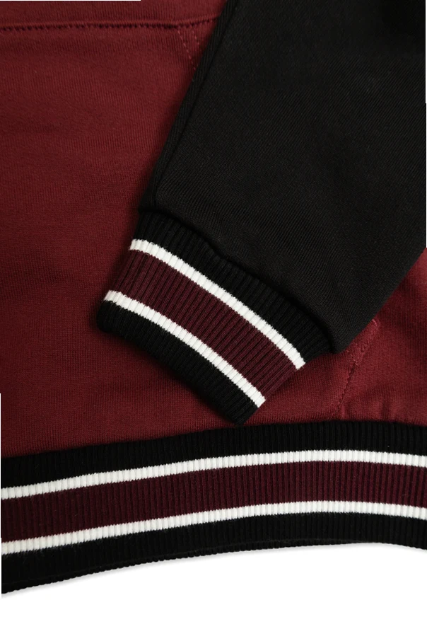 Imbued with sophisticated athletic charm, this Dolce & Gabbana Kids hooded sweatshirt is an exquisite choice for discerning young wardrobes. Crafted from plush, premium cotton, its rich burgundy body contrasts elegantly with deep black sleeves, hood, and hem, elevated by refined white and burgundy striped ribbing.