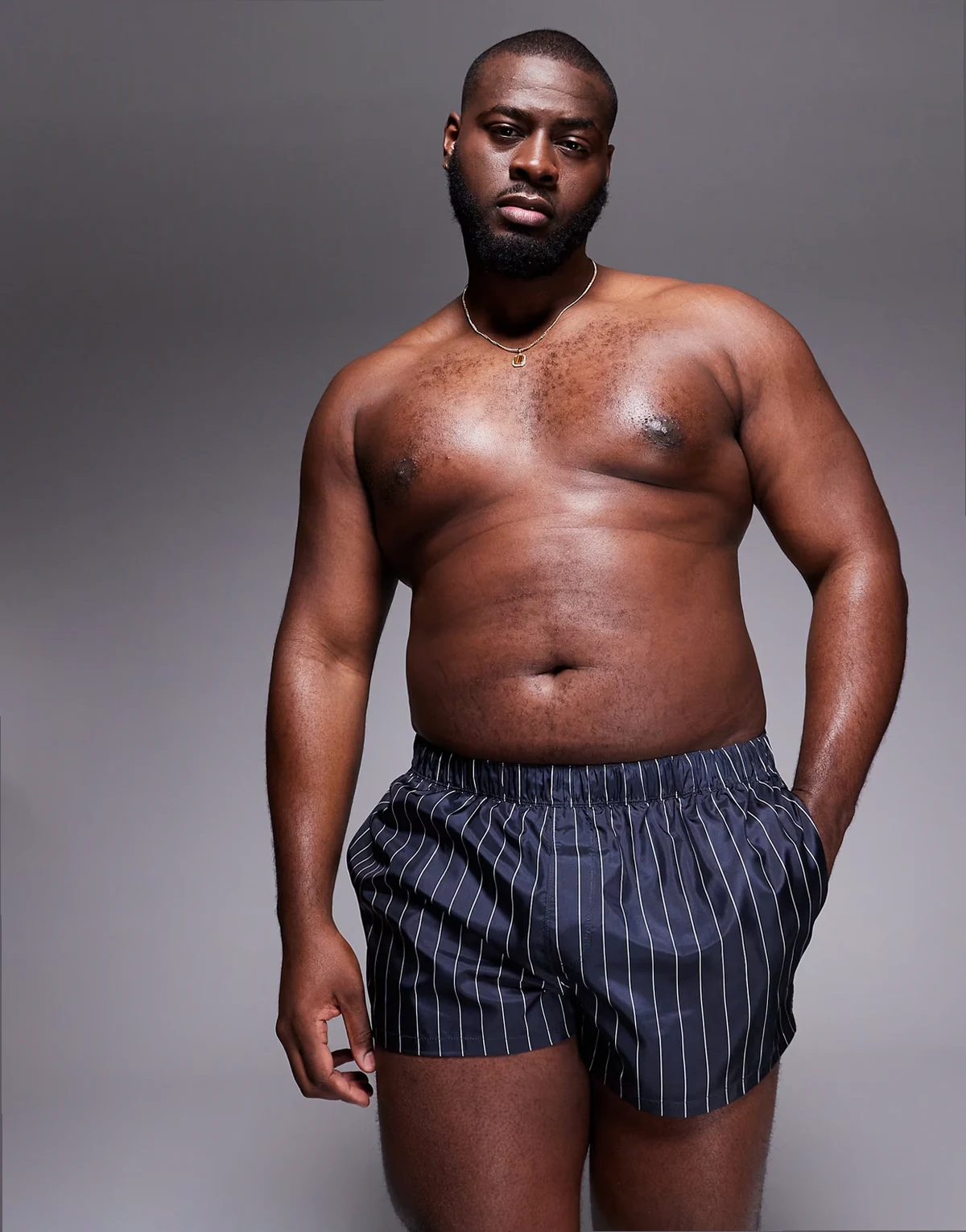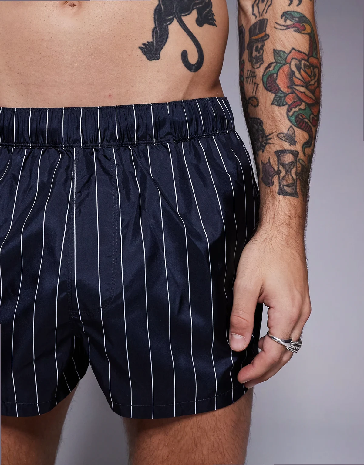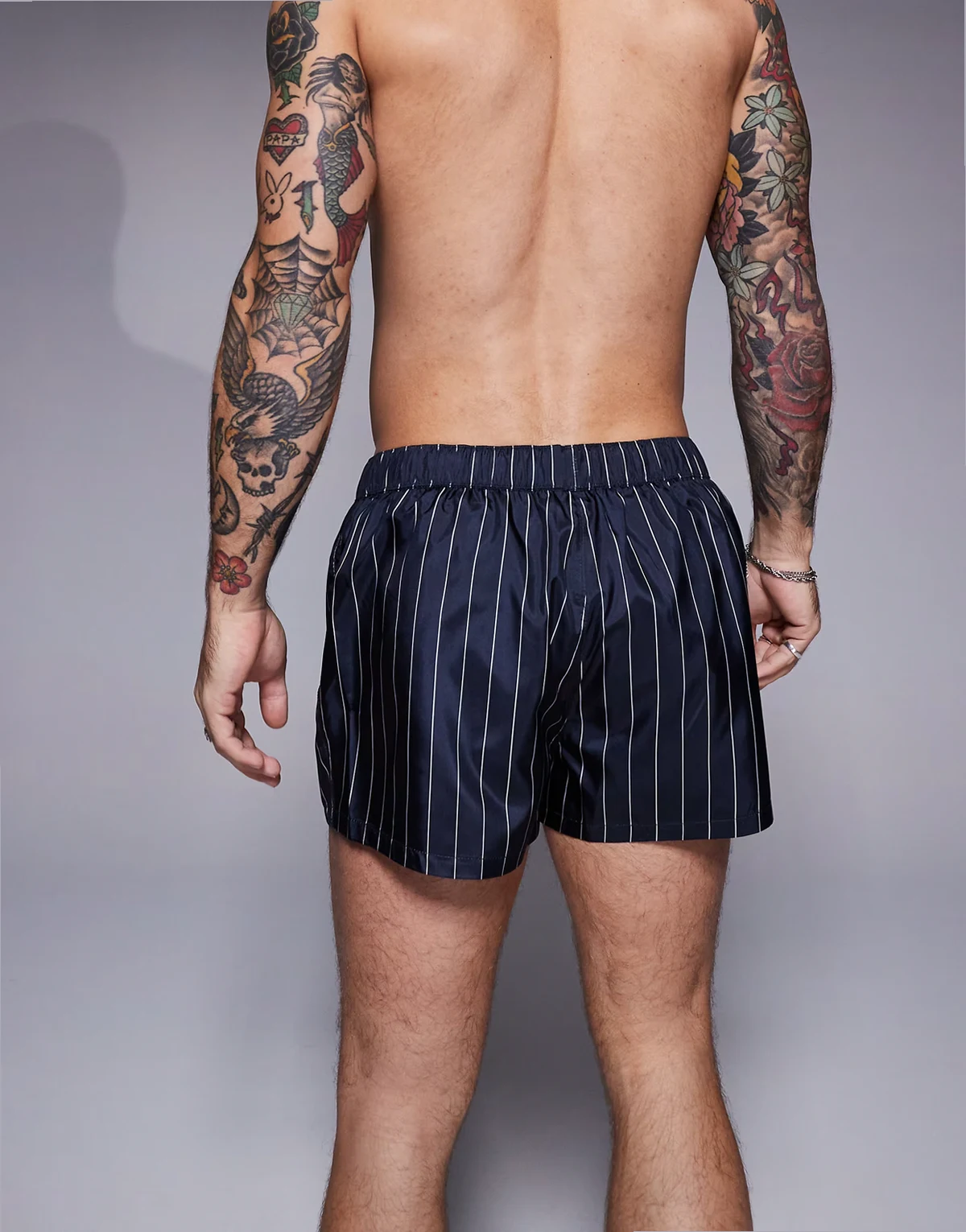 swim short in super short length in navy and white pin stripe