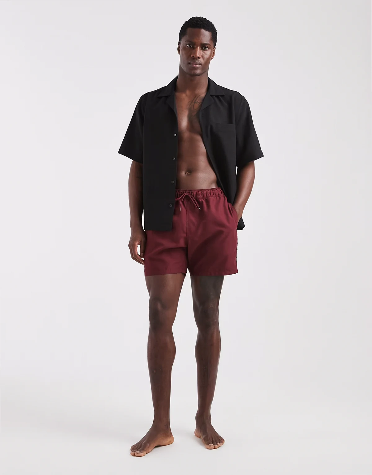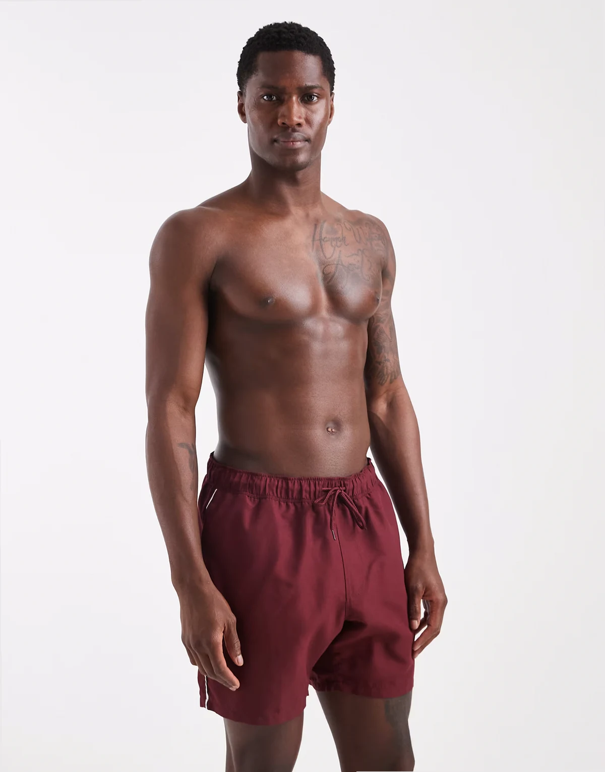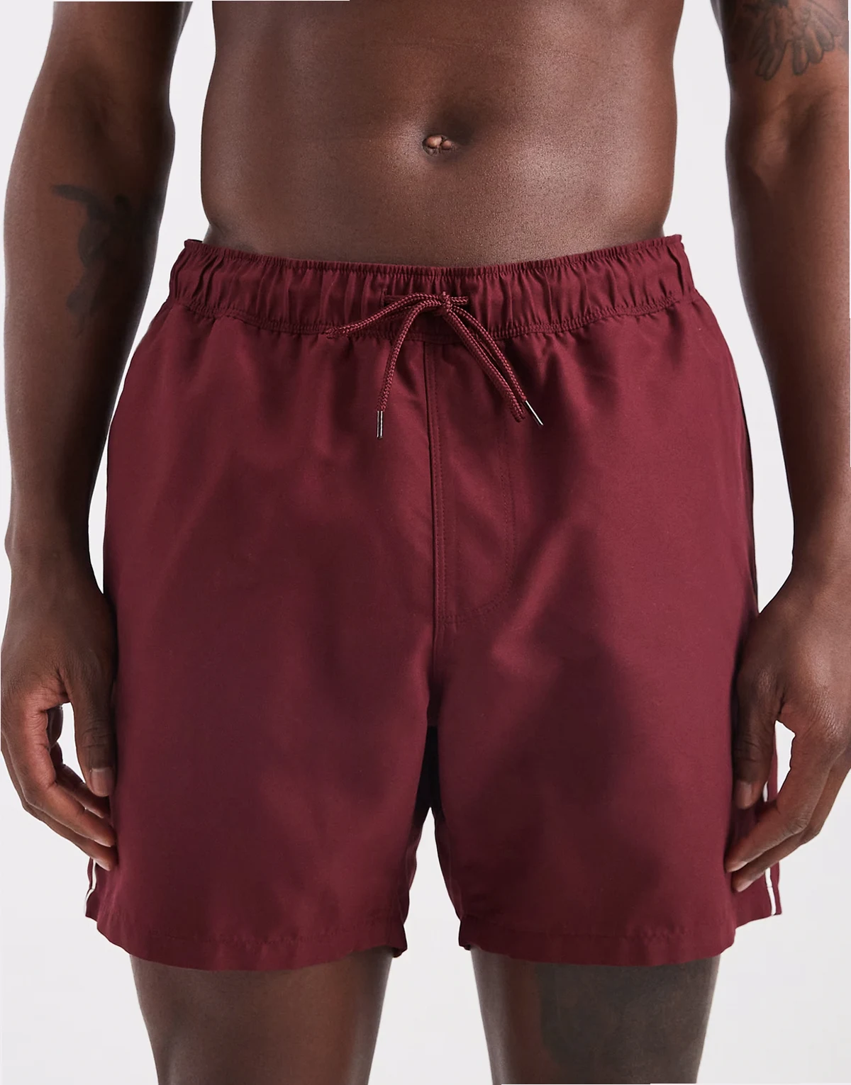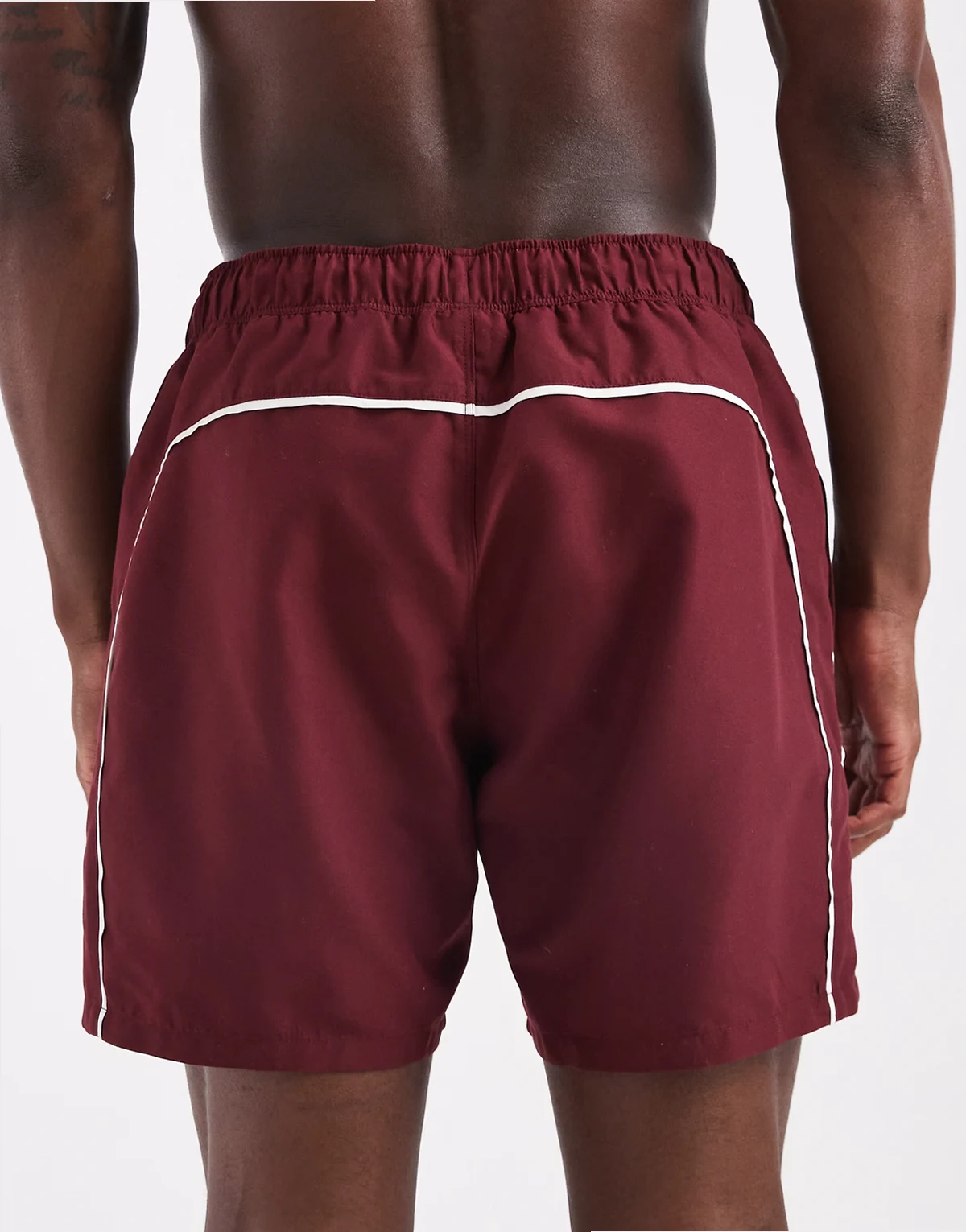 swim shorts in mid length in burgundy with contrast white binding