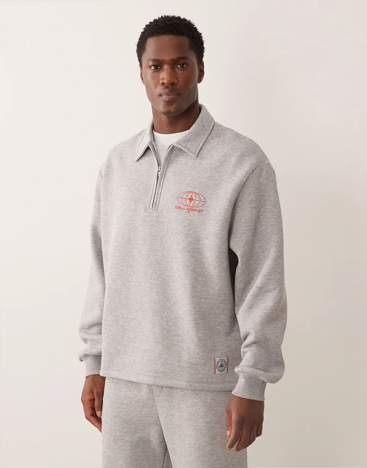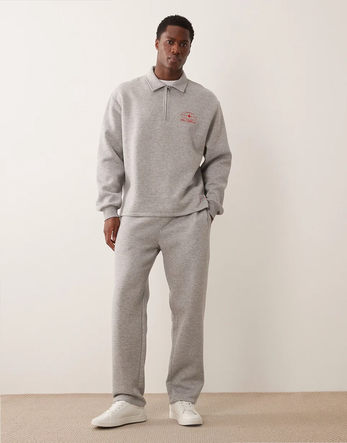 quarter zip polo sweatshirt and straight fit sweatpants set with woven label in gray heather
