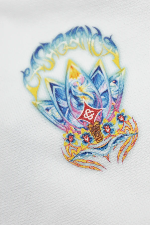 The standout feature of this piece is its vivid artistic print —an enchanting, multicolored animal or mask motif—displayed exquisitely on the left chest and with bold impact across the back. The vibrant palette illuminates the pristine white background, offering an expressive and unique visual narrative without overt branding, showcasing true artistic individuality.