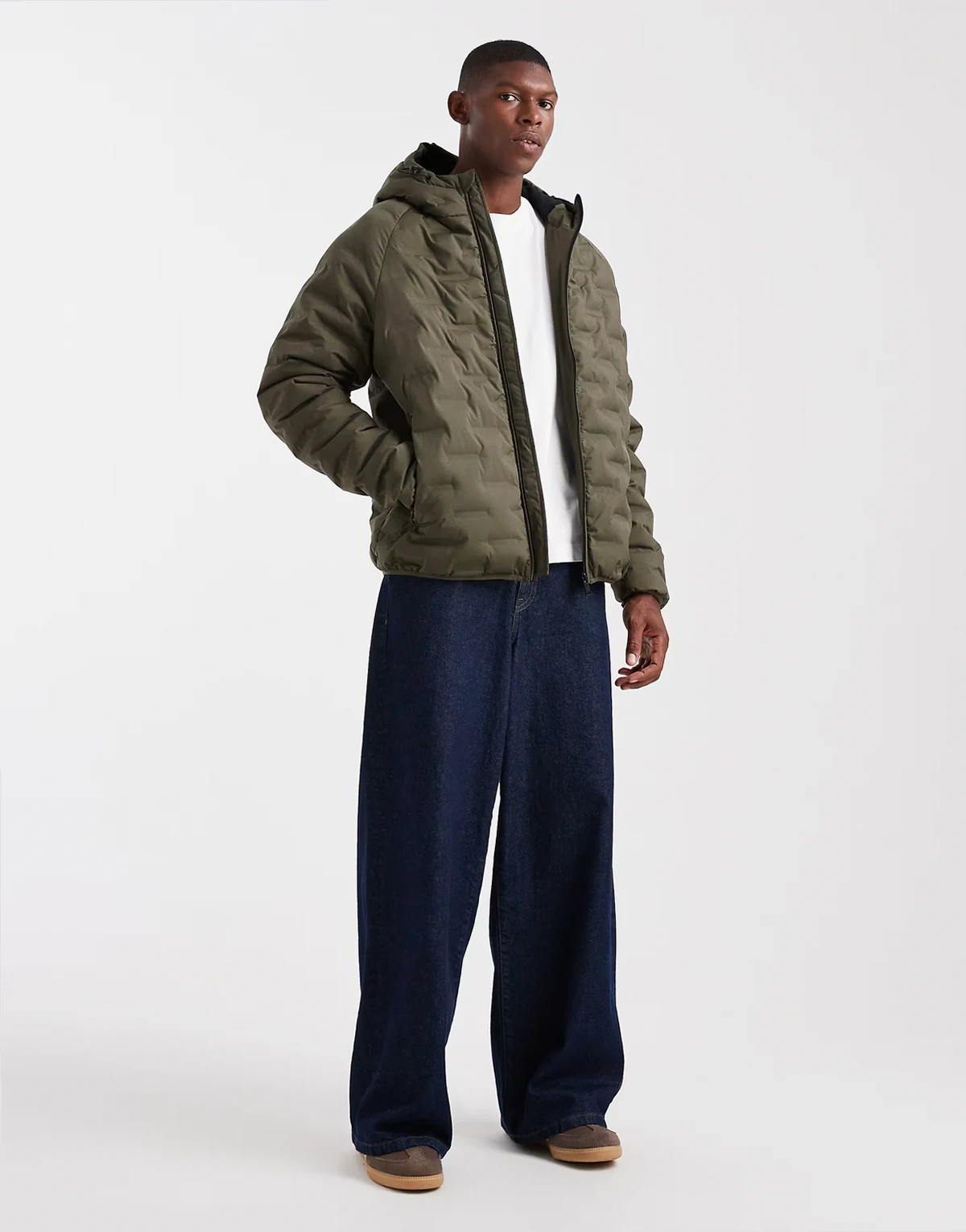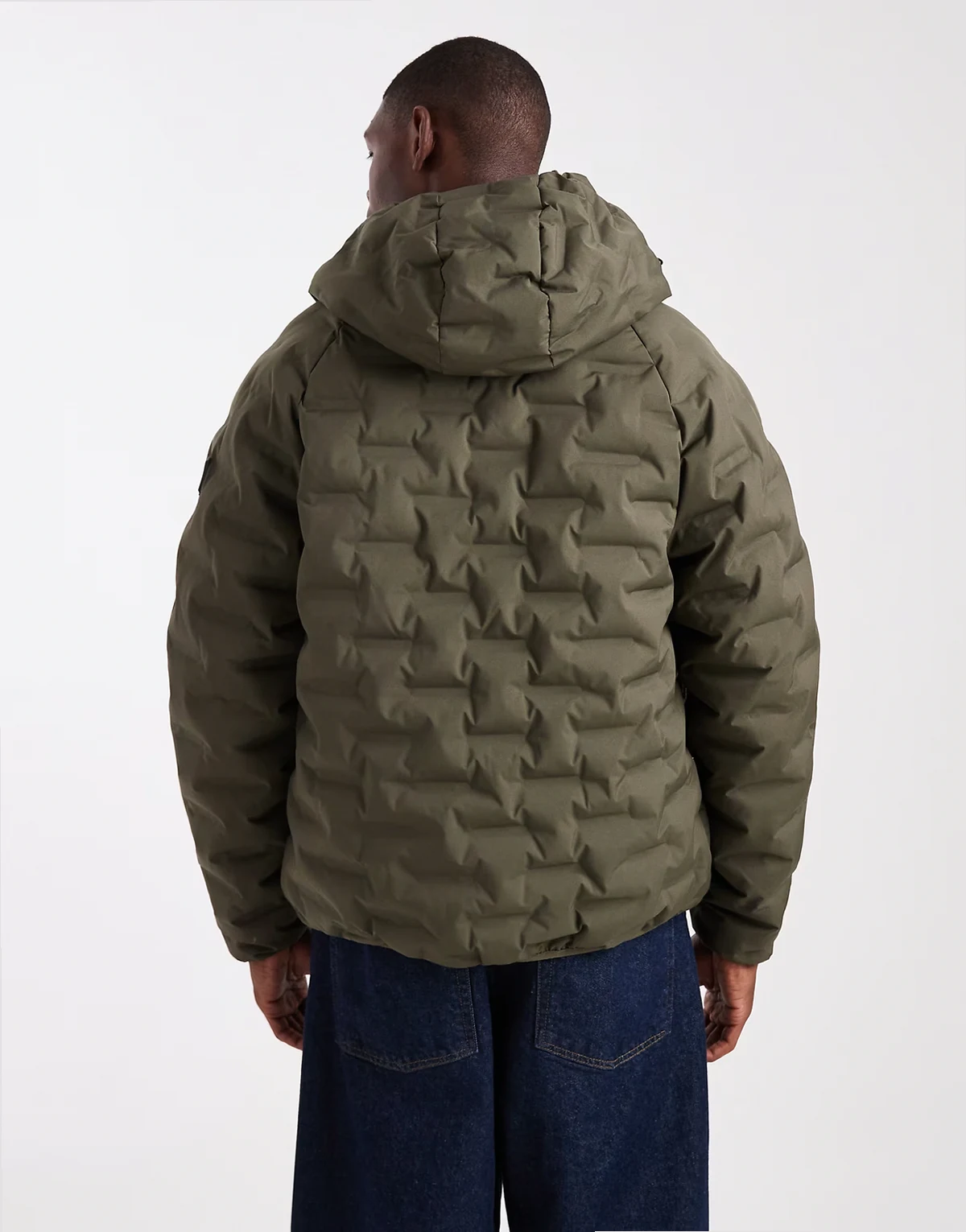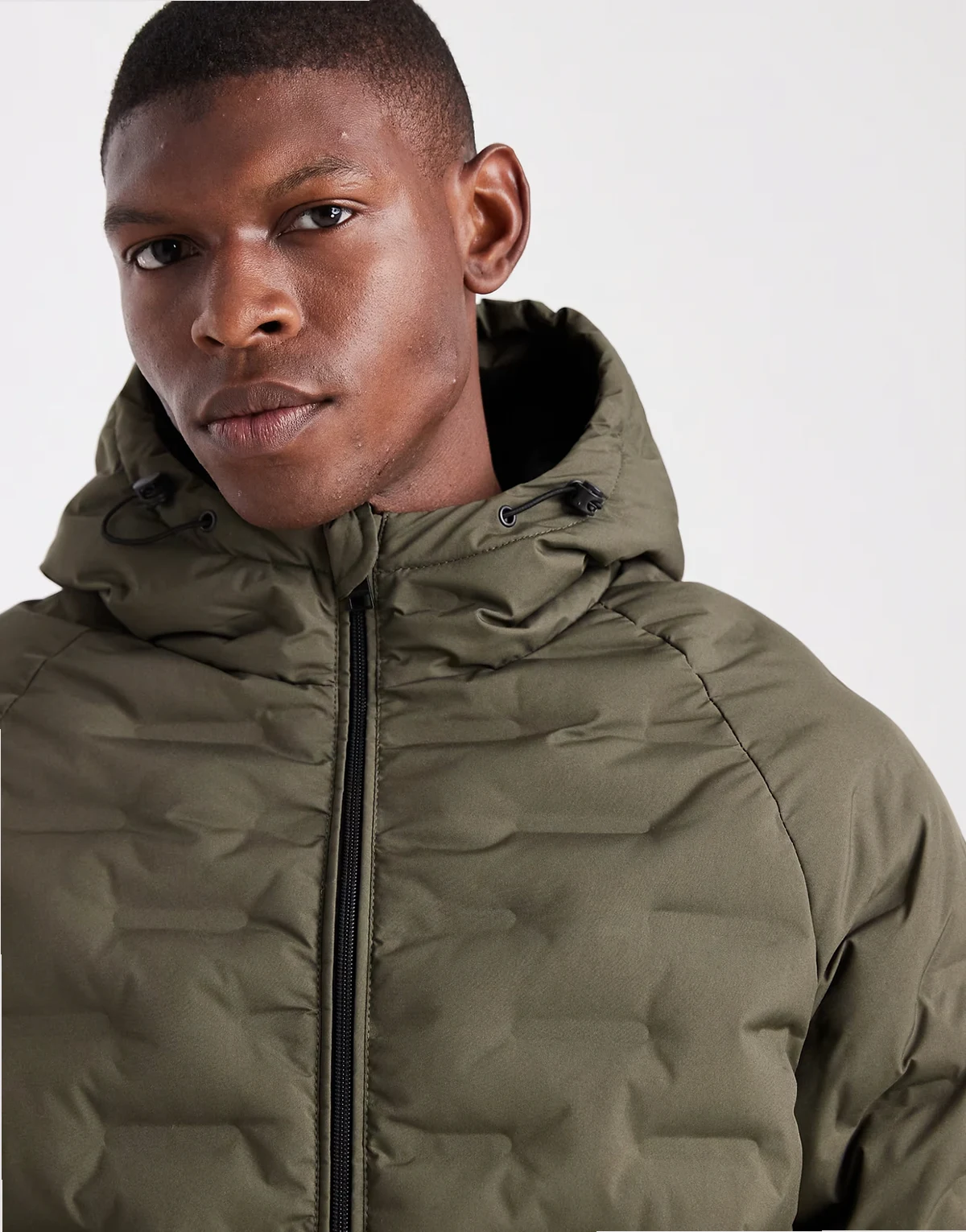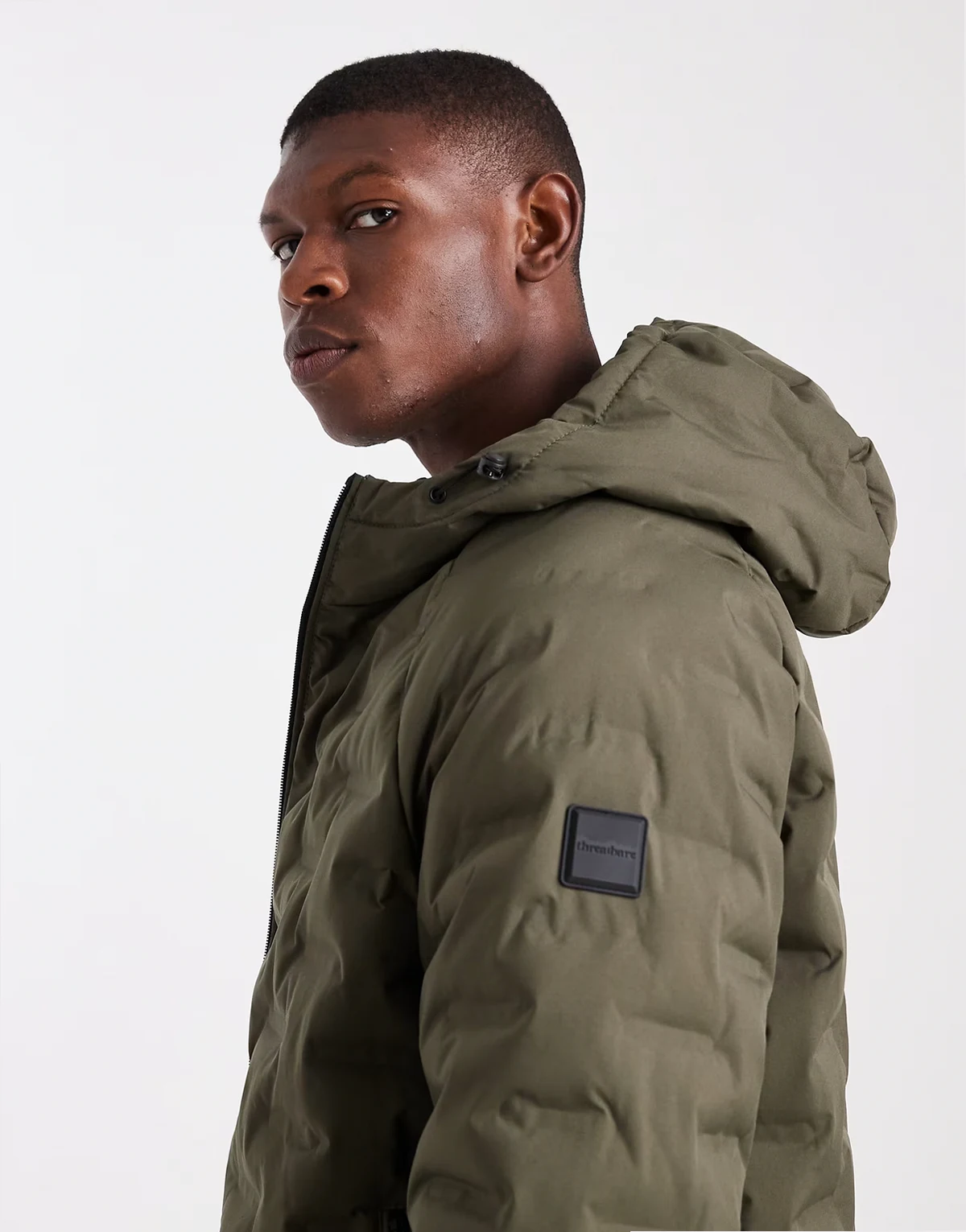 textured puffer coat with hood in khaki green