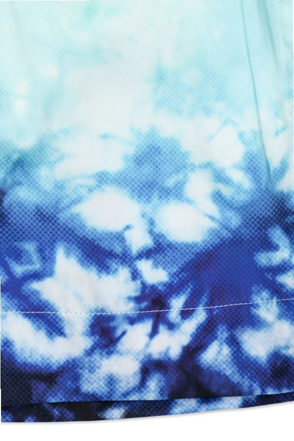 The radiant tie-dye design transitions masterfully from light sky blue to deep navy, presenting a unique, abstract pattern across the fabric. A single, neatly stitched back pocket showcases a vivid, graffiti-inspired graphic motif, lending the shorts an elevated, exclusive character. The designer’s signature logo is thoughtfully integrated within this colorful artwork, marking these shorts as truly distinctive.