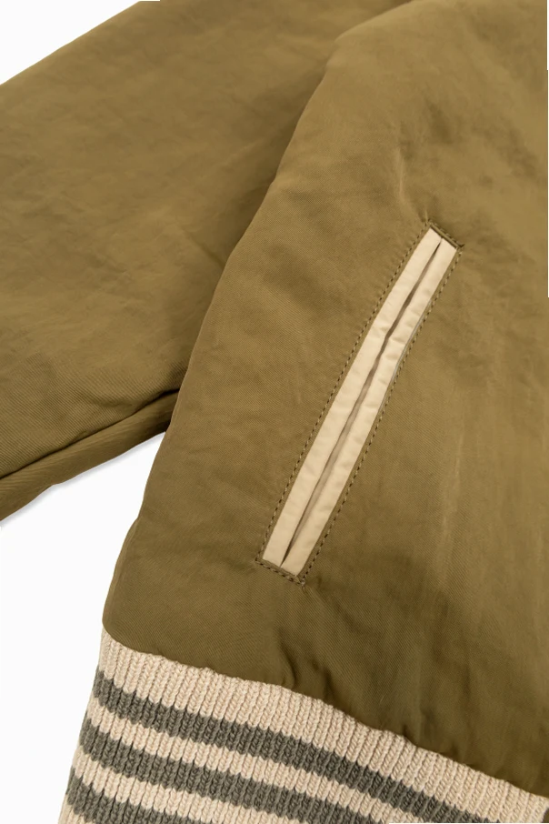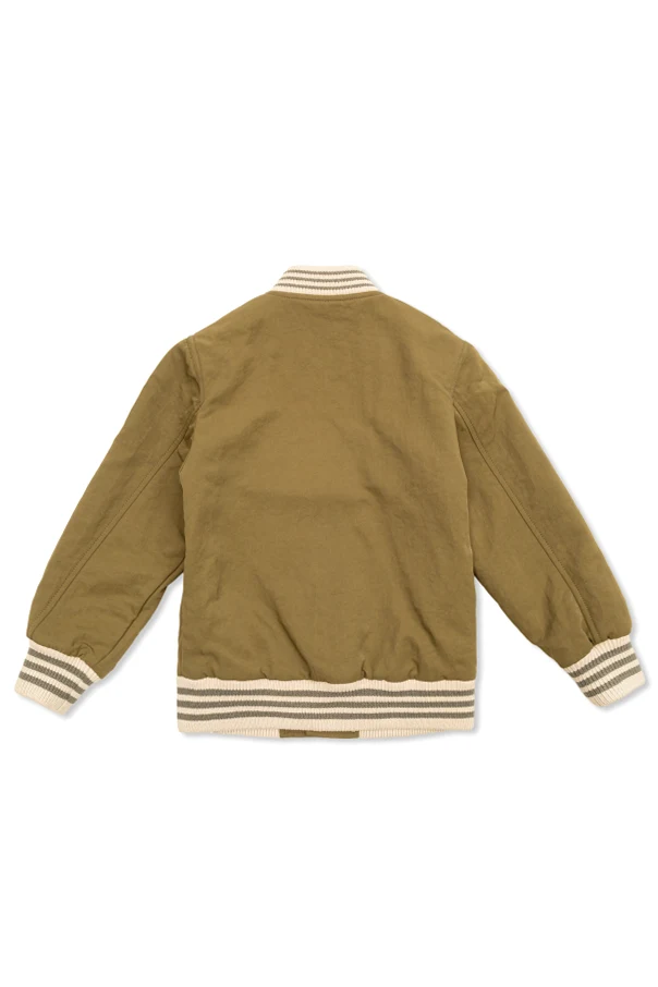 Exuding playful sophistication, this olive green bomber jacket for boys encapsulates the signature spirit of Golden Goose Kids. The classic cut features a rounded shoulder silhouette, cropped length, and finely ribbed finishes at the collar, cuffs, and waistband, promising impeccable comfort and unrestricted movement.