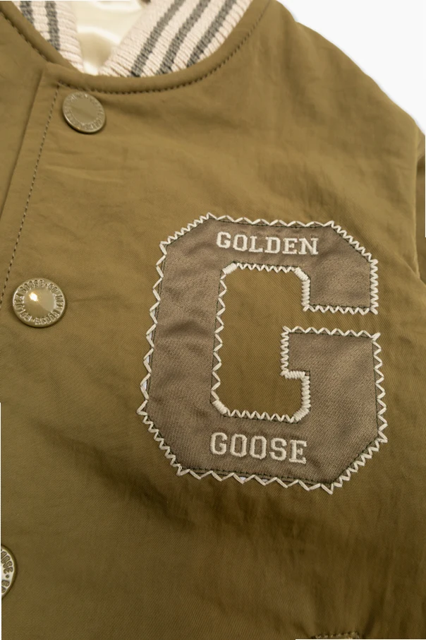 Crafted from a refined matte textile, the exterior provides both durability and a soft handfeel, while the smooth viscose lining ensures delicate comfort against the skin. Standout details include the bold “G” patch with distinctive zigzag stitching—an homage to the brand’s expressive character—complemented by crisp white “GOLDEN” and “GOOSE” lettering within. Subtly engraved metallic buttons echo the jacket’s elegant color palette.