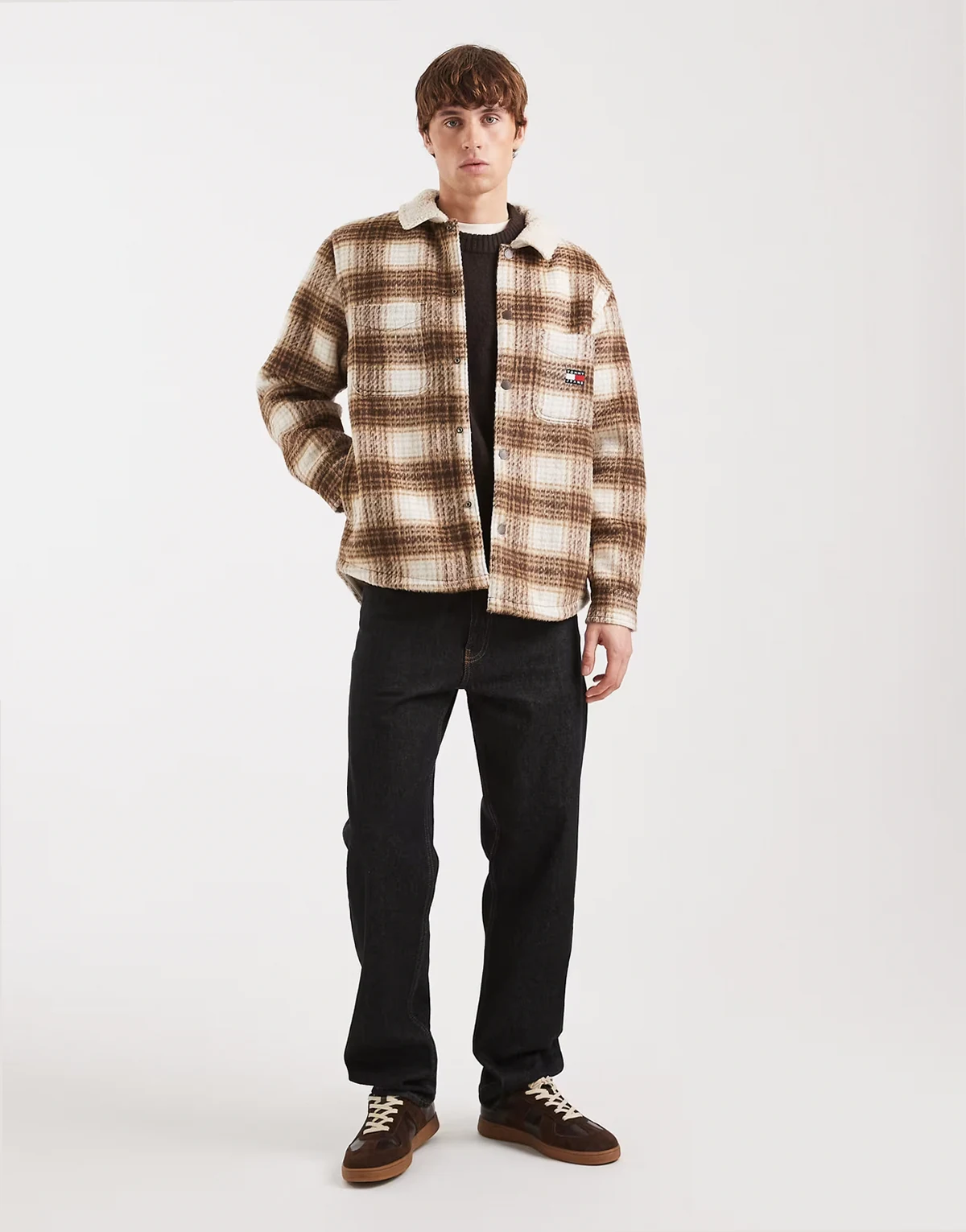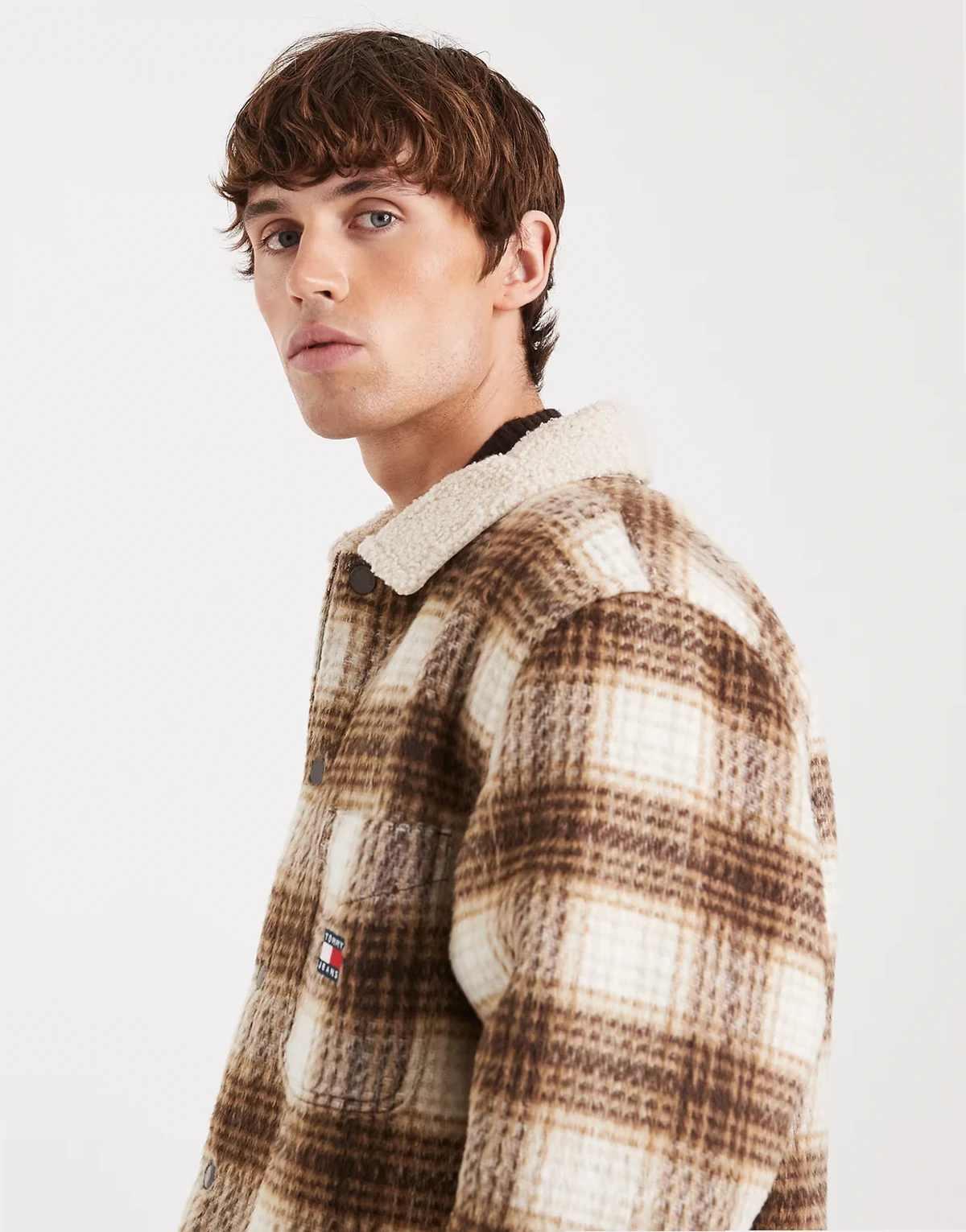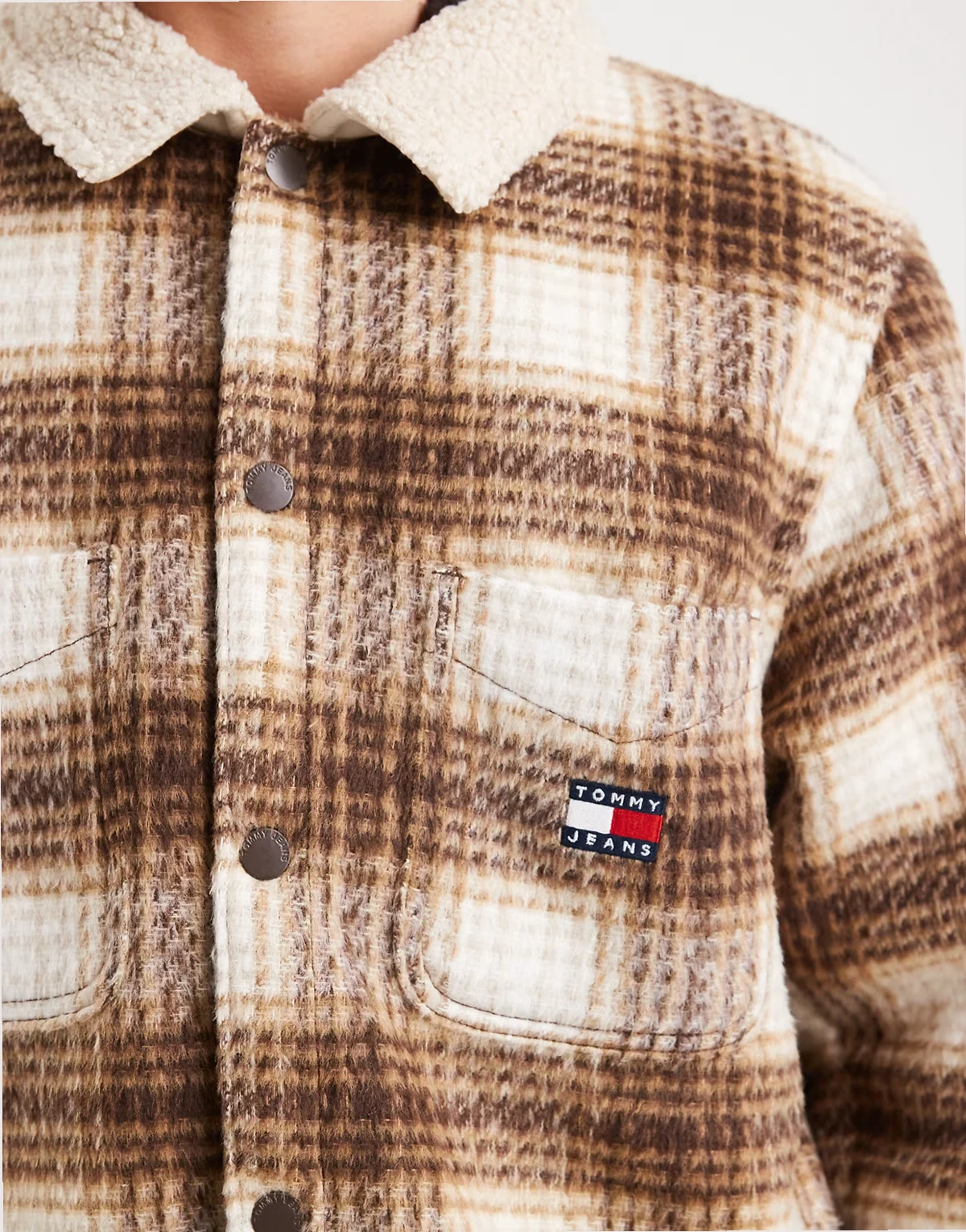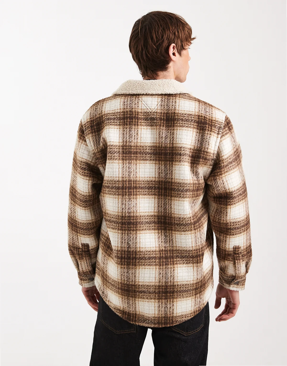 chest logo check teddy overshirt in brown