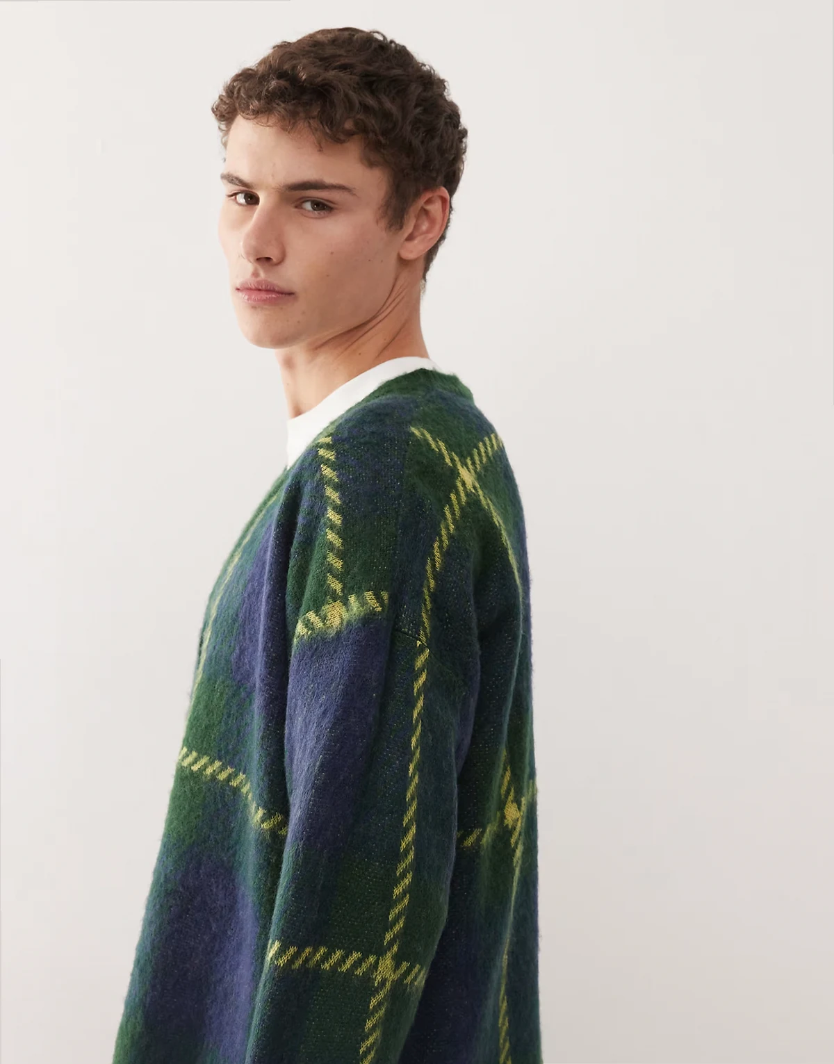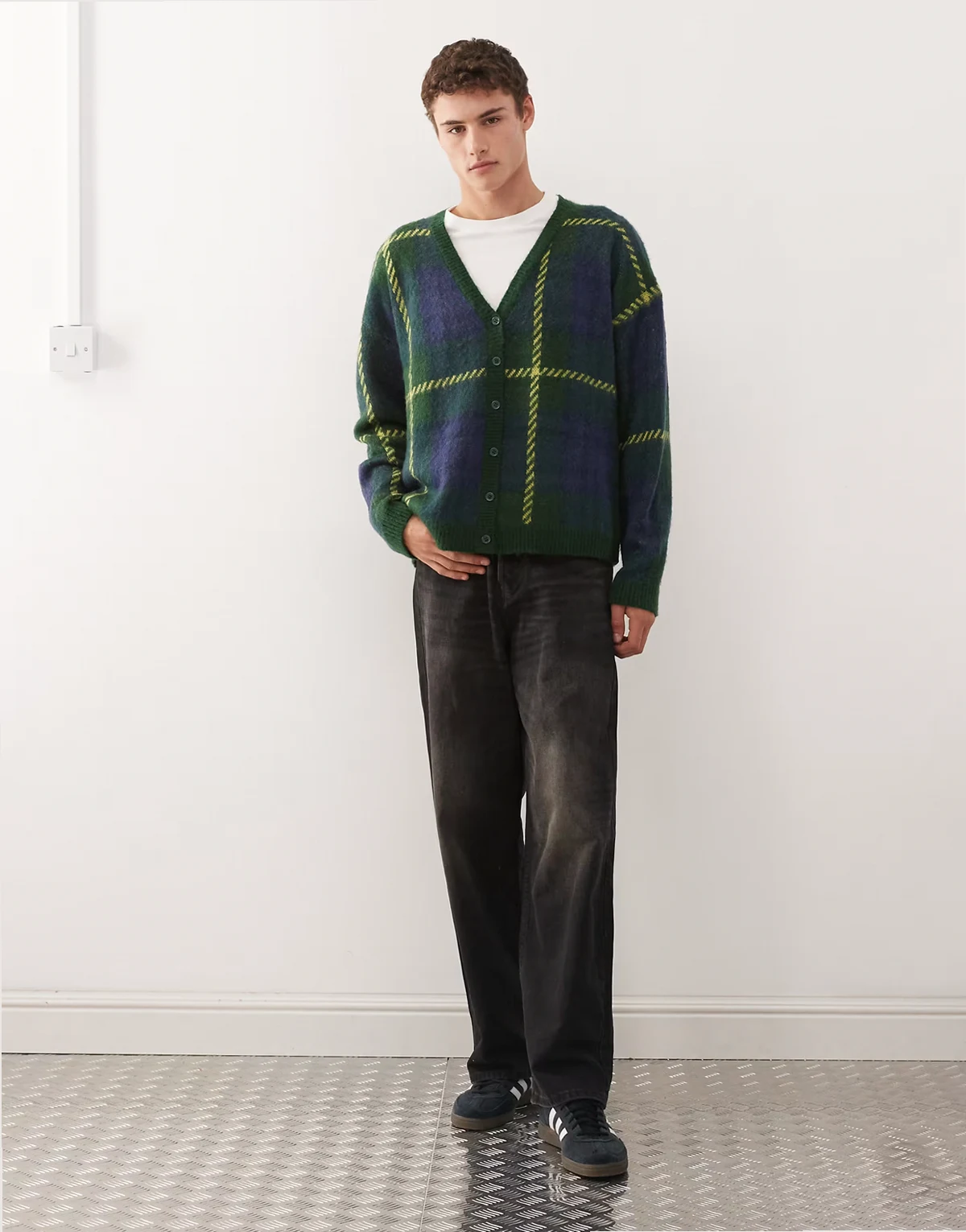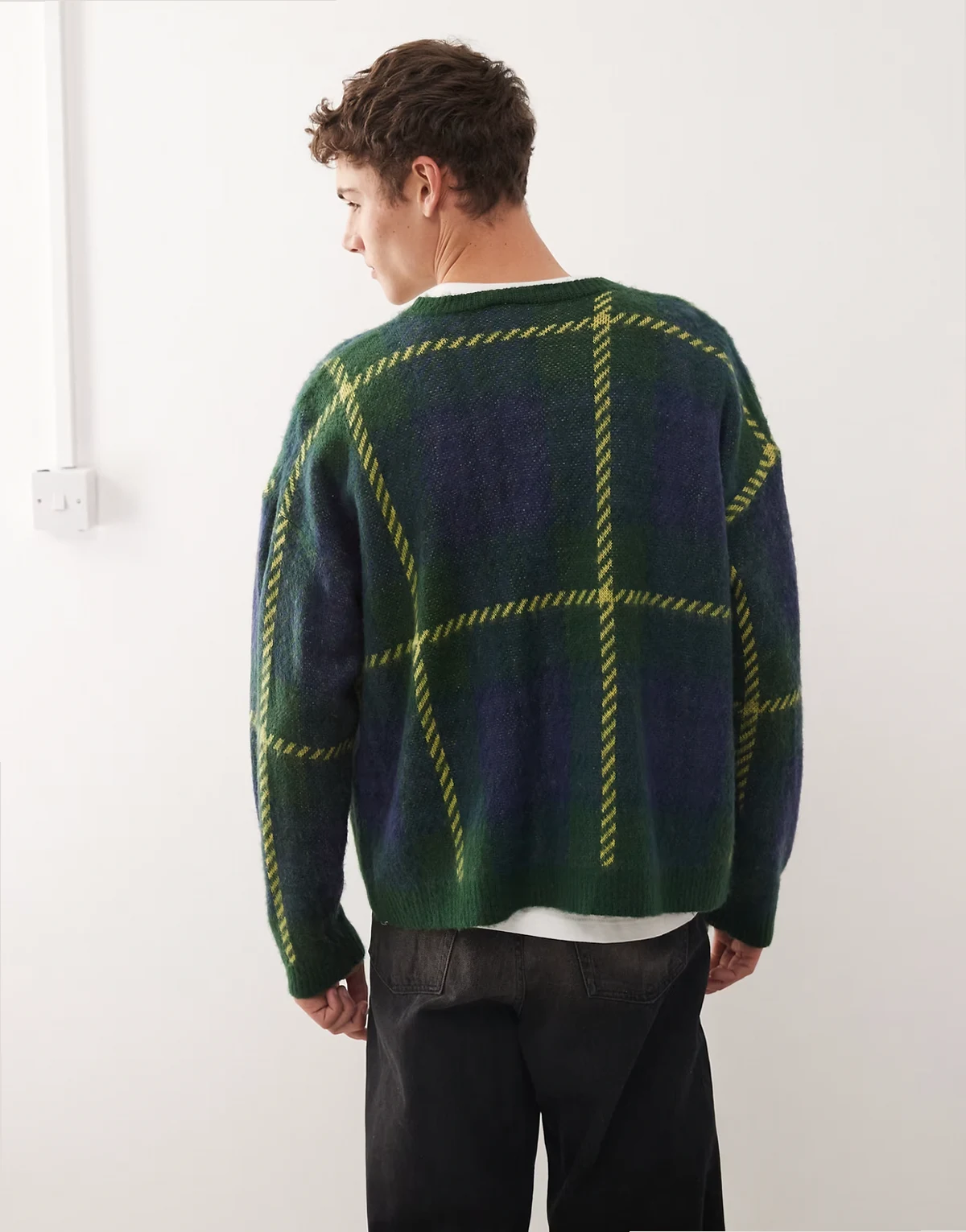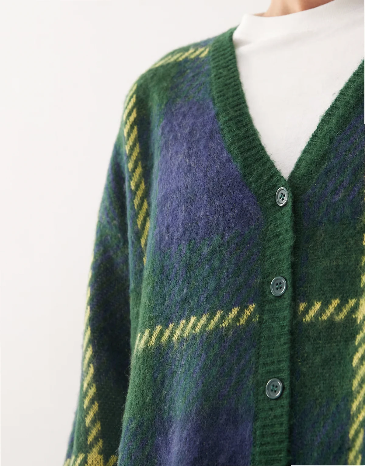 knit cardigan with blue and neon green plaid