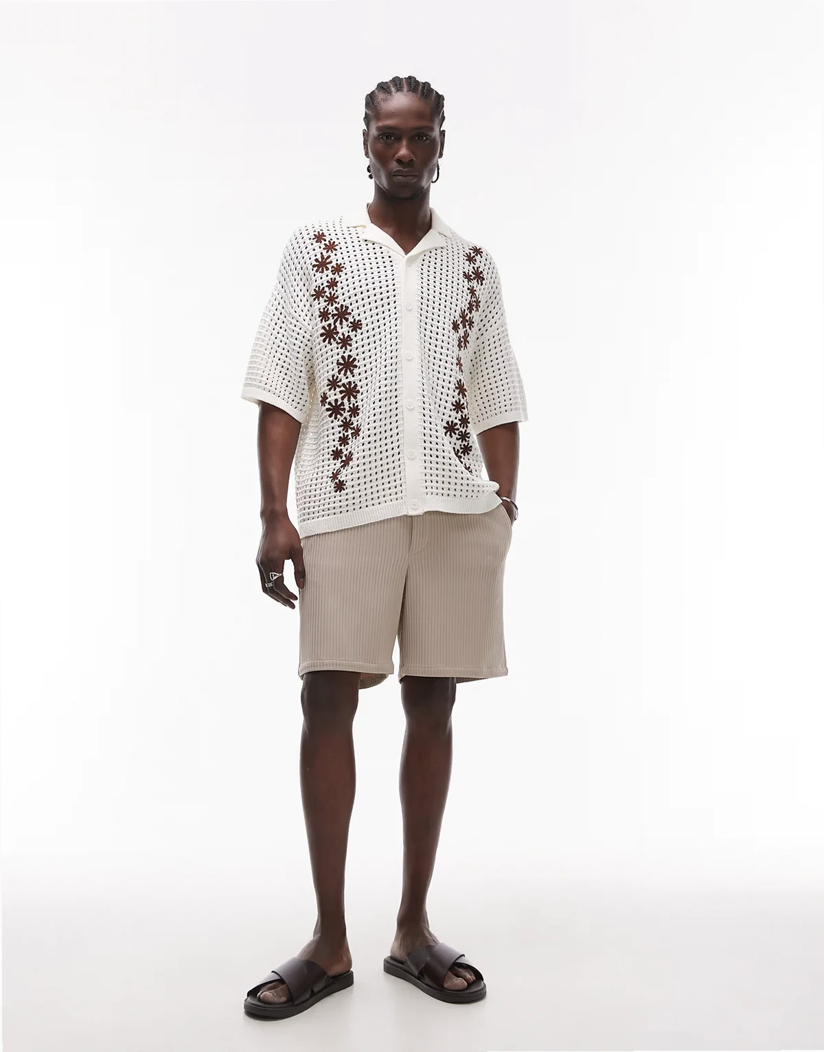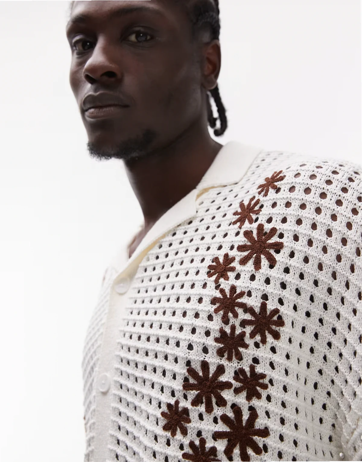 camp collar embroidered floral crochet shirt in ecru