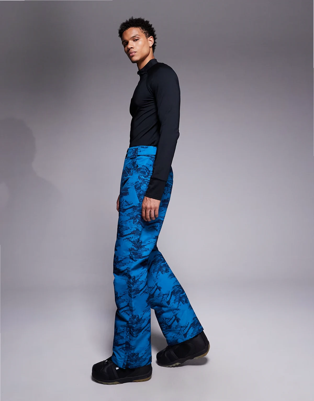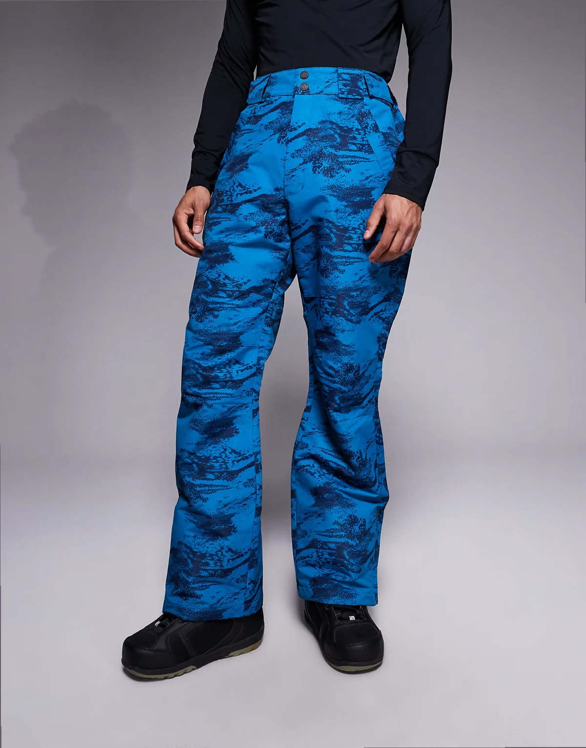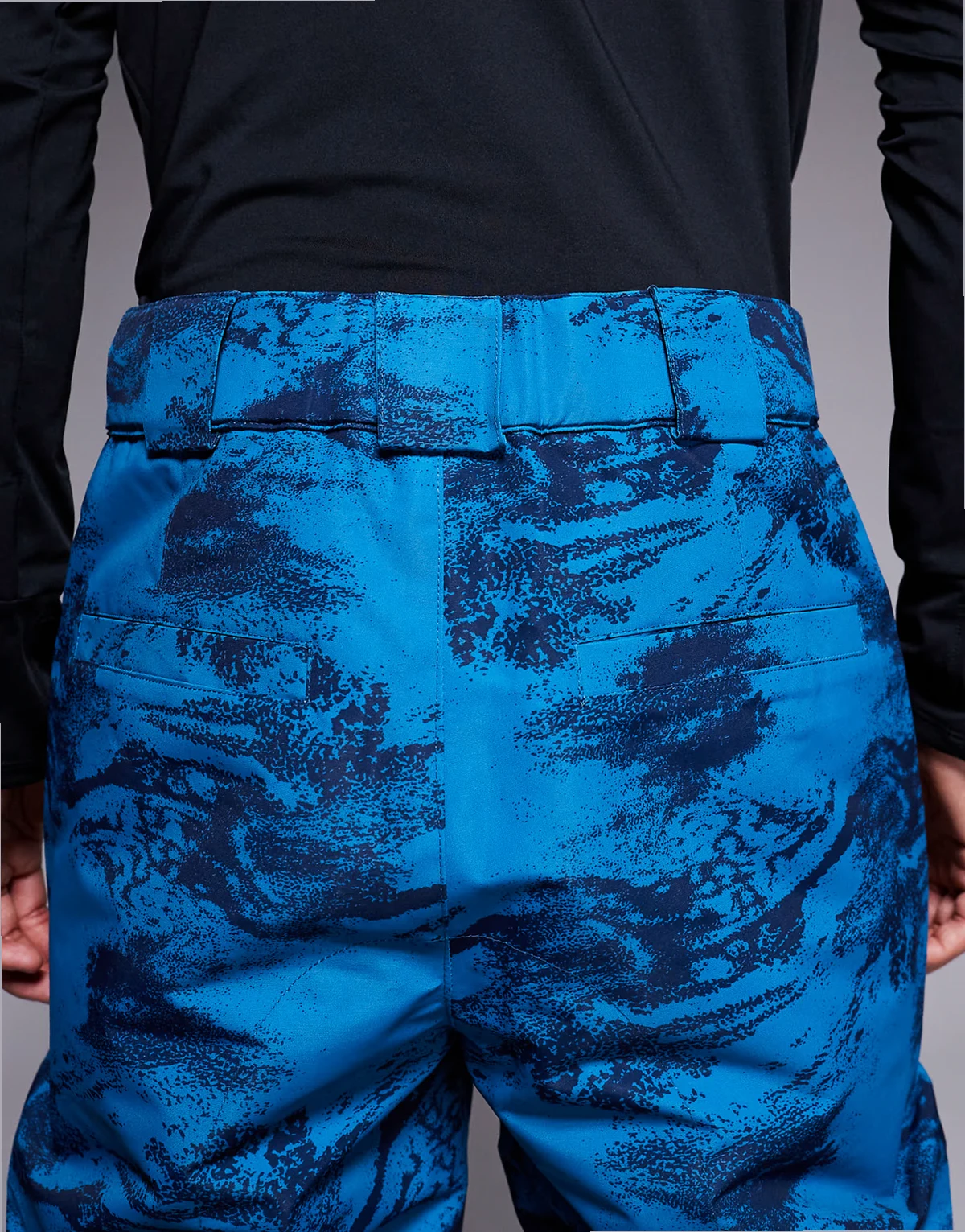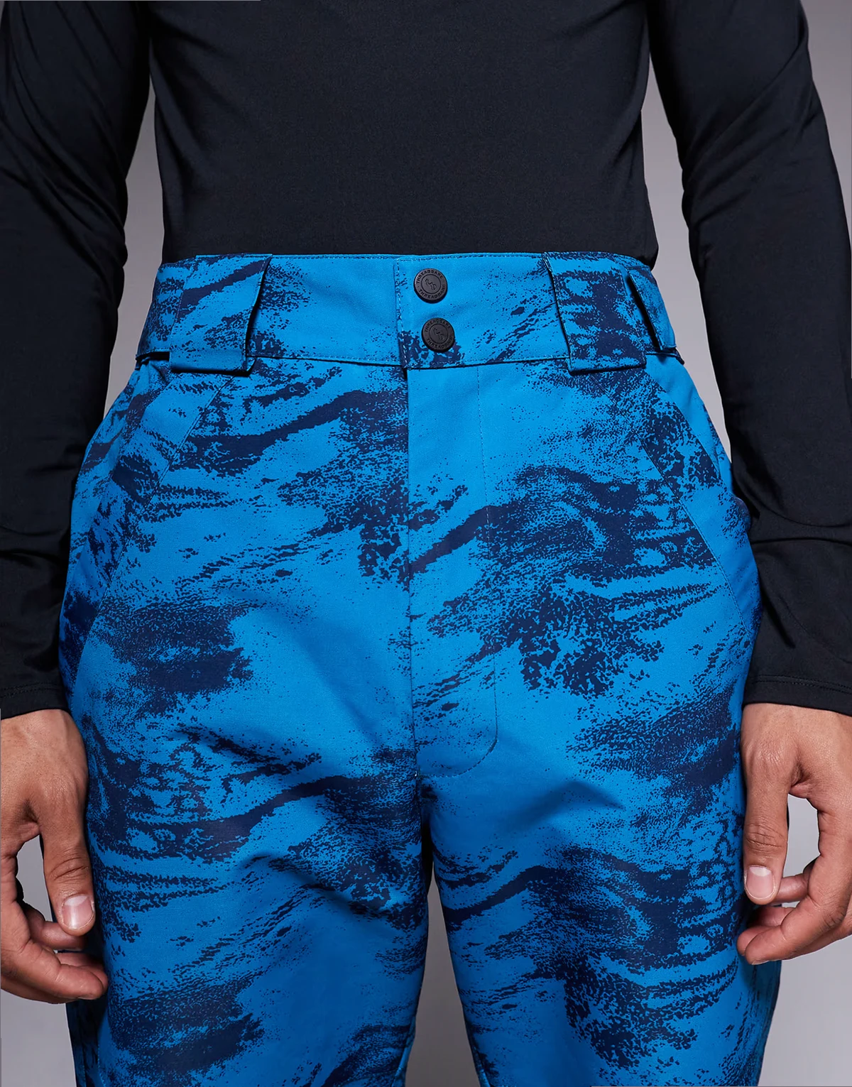 ski pants in blue and navy print