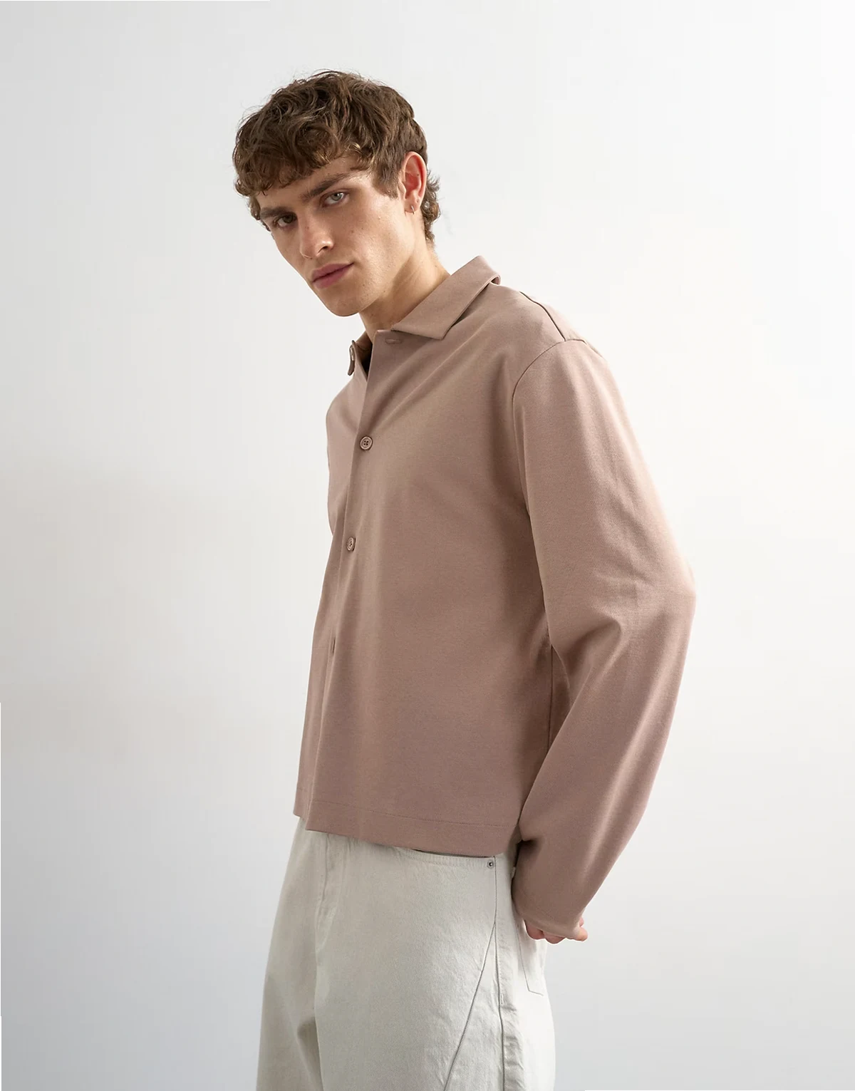 This shirt is crafted from soft jersey in a plain design. It features a spread collar, button placket, long sleeves and is cut with a cropped fit.