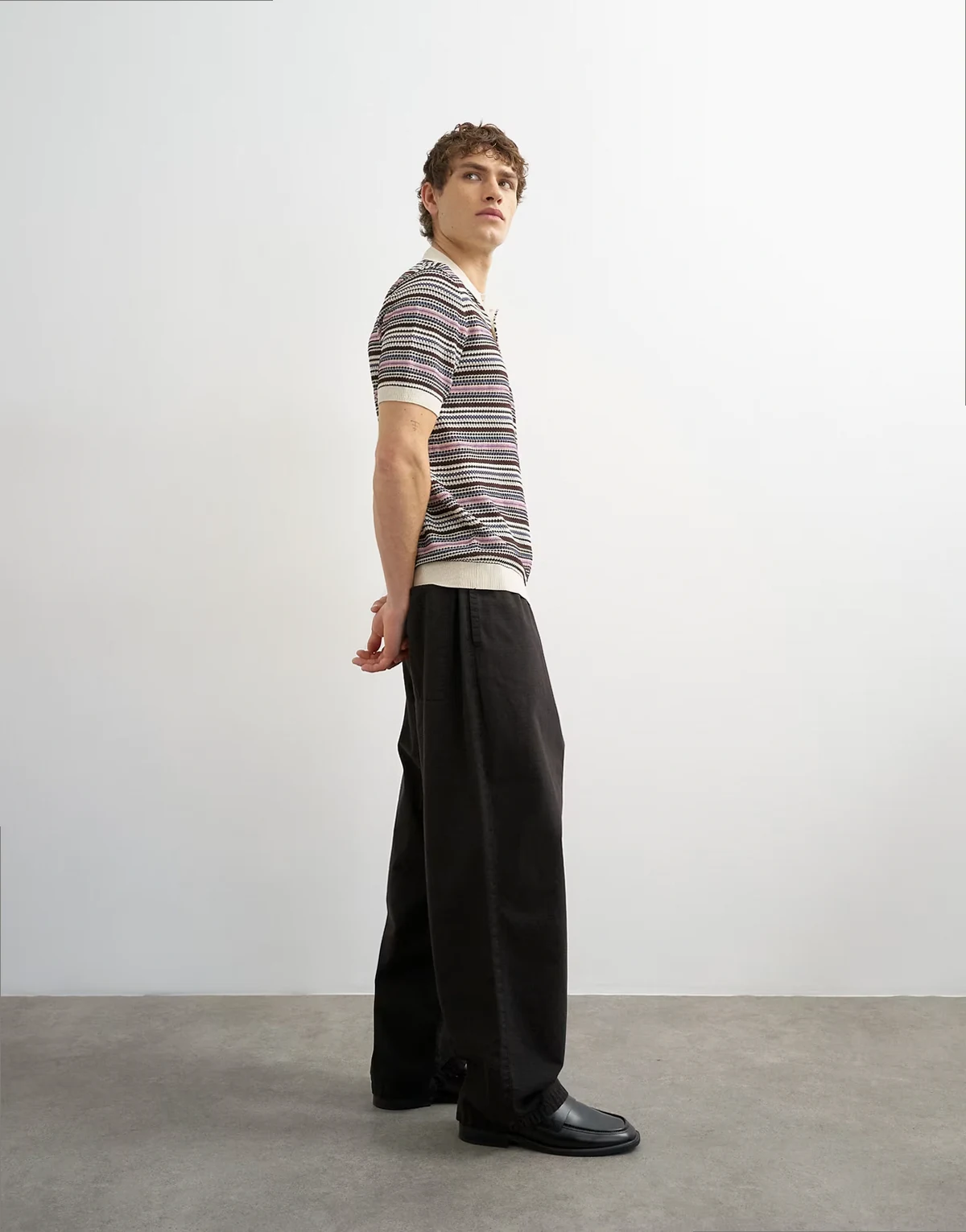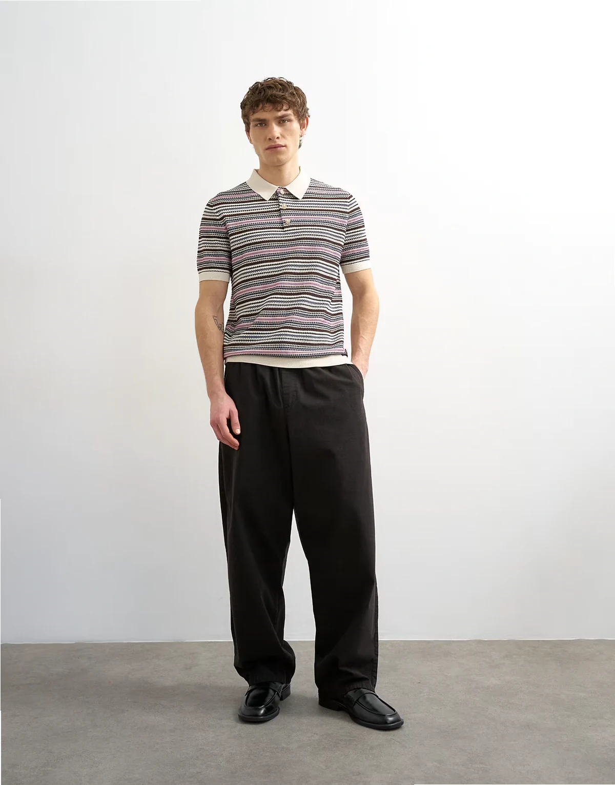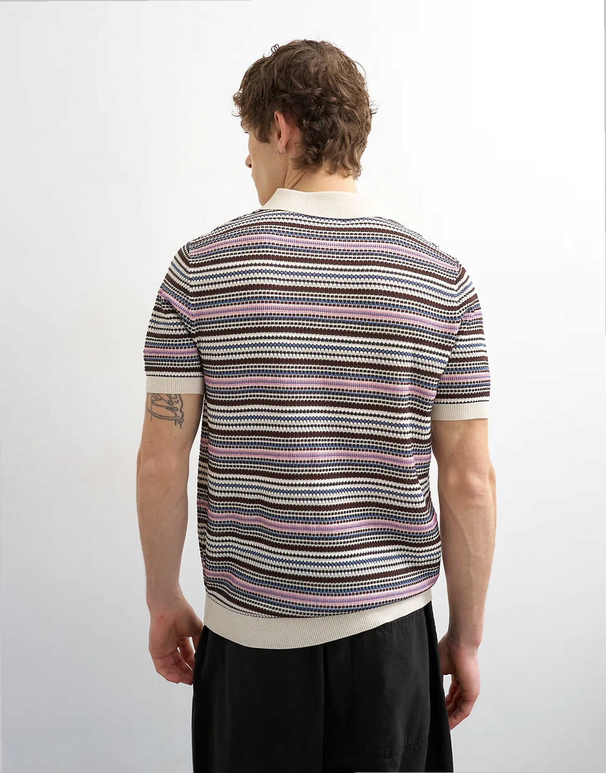 This T-shirt is crafted from a knitted fabric in an all-over striped design. It features a polo collar, short sleeves, and is cut with a regular fit.