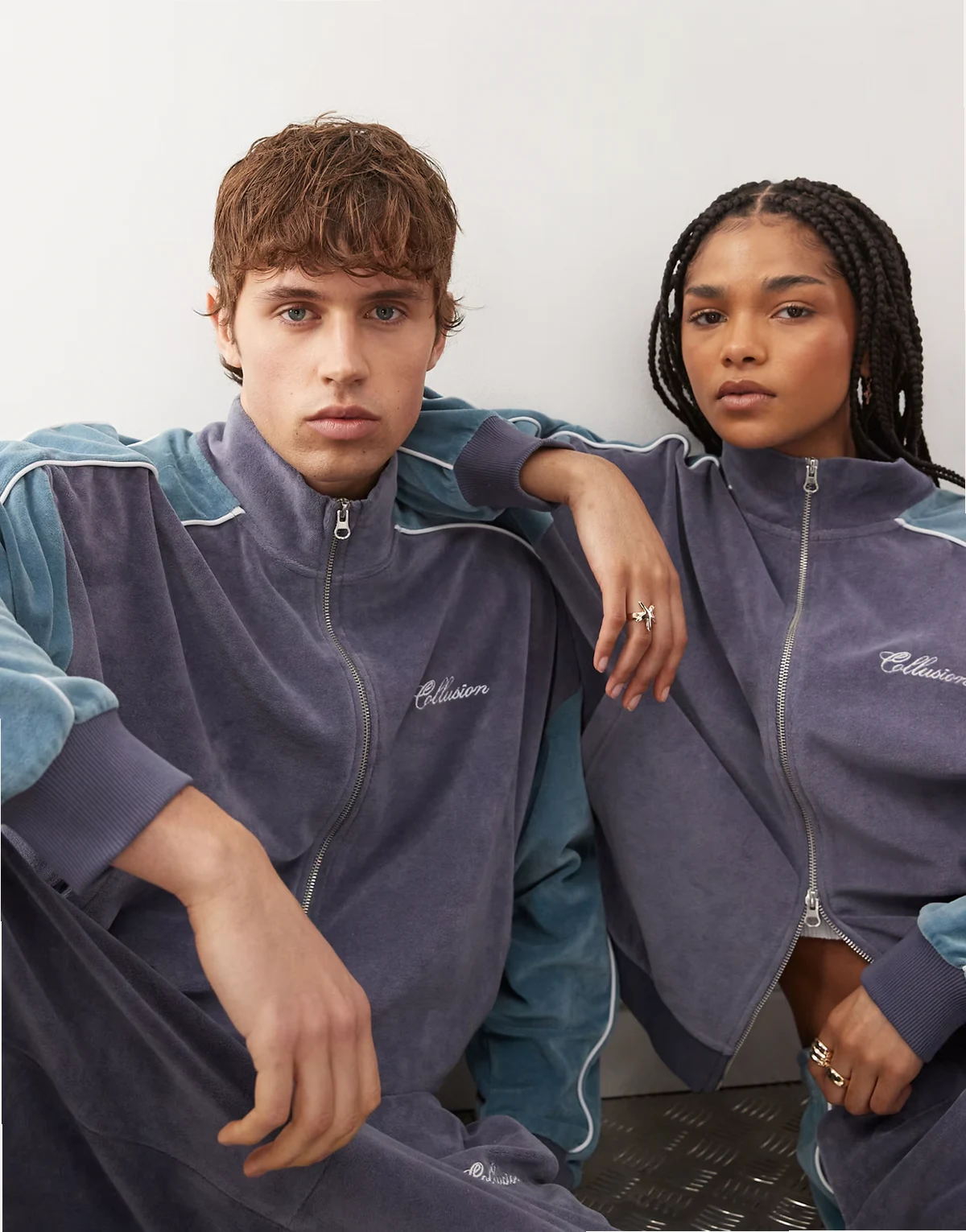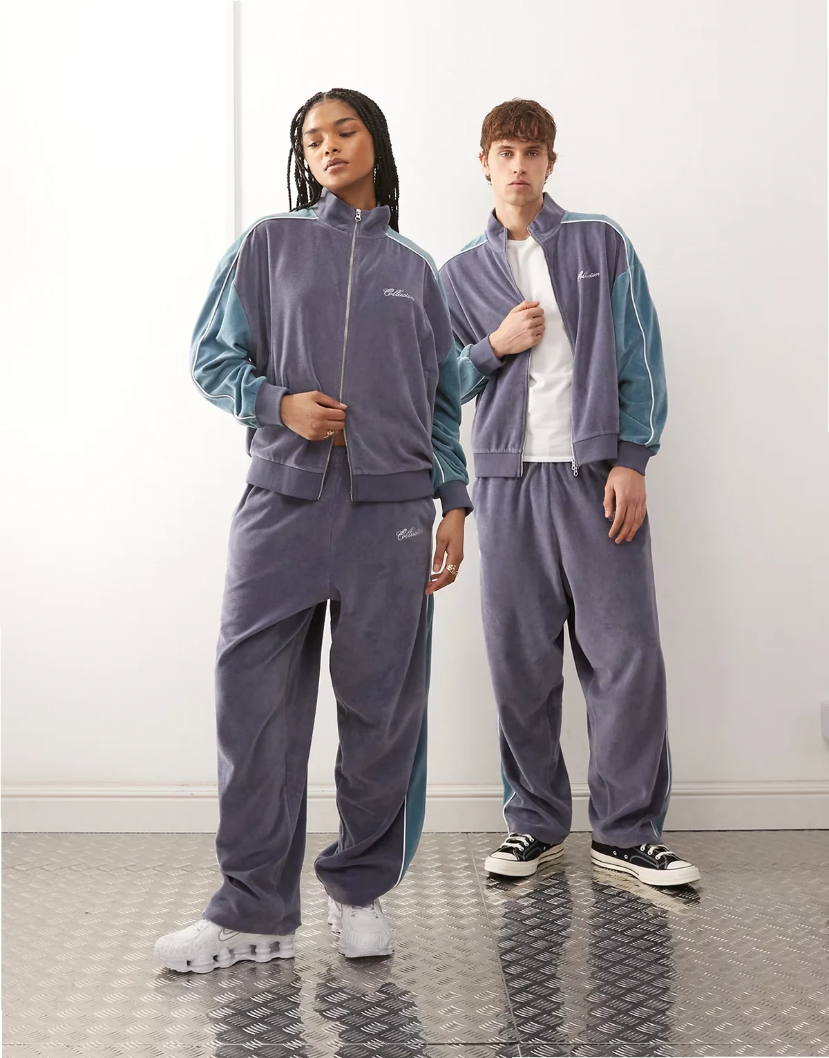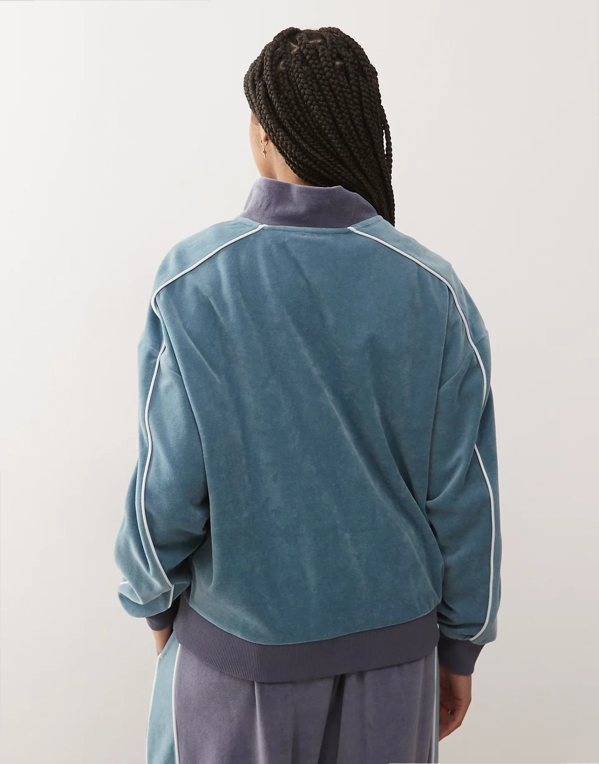 Unisex velour track jacket in purple and blue