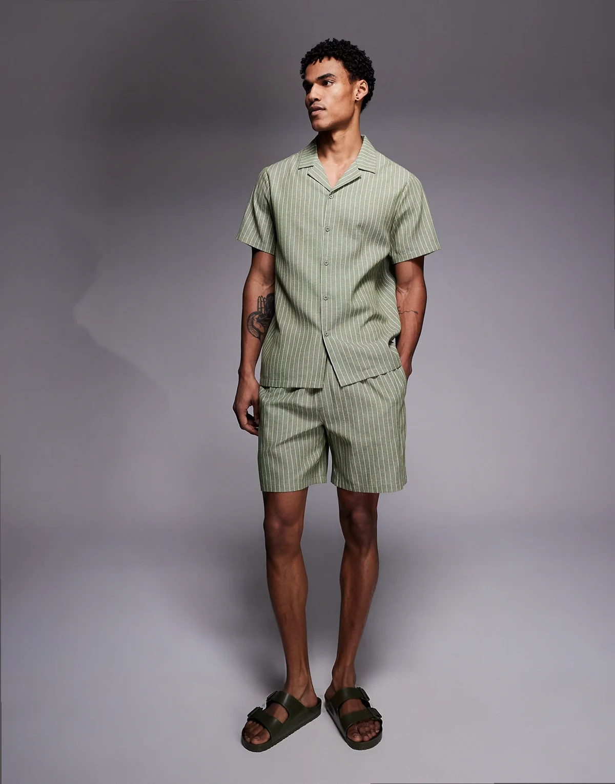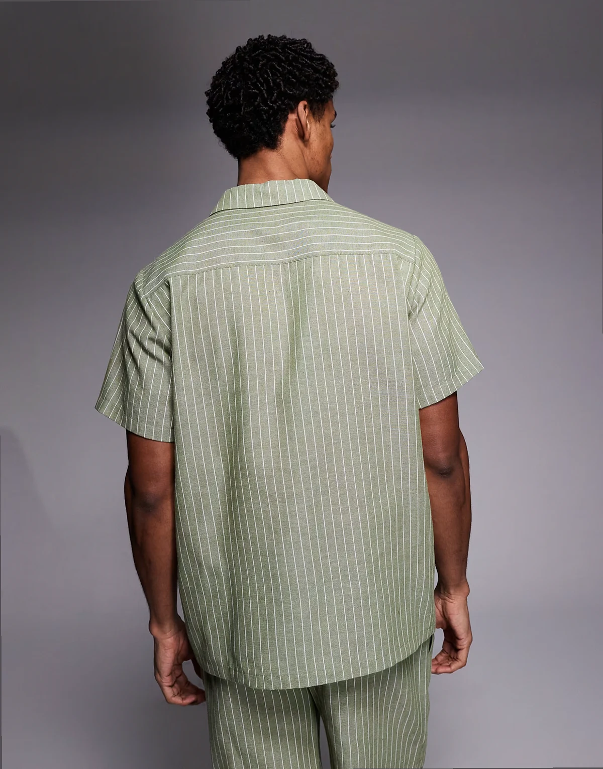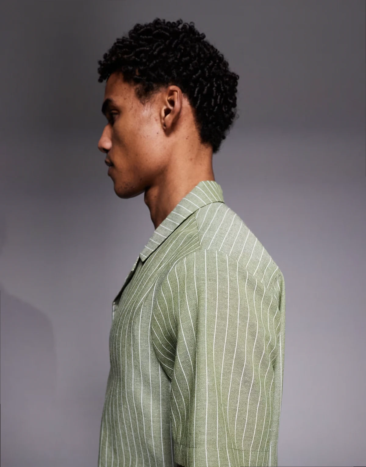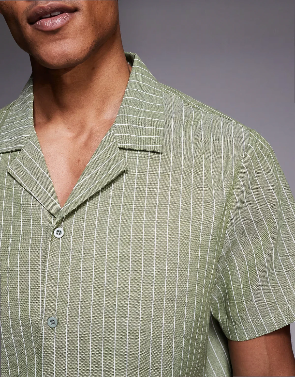 short sleeve linen blend shirt in khaki-green stripes