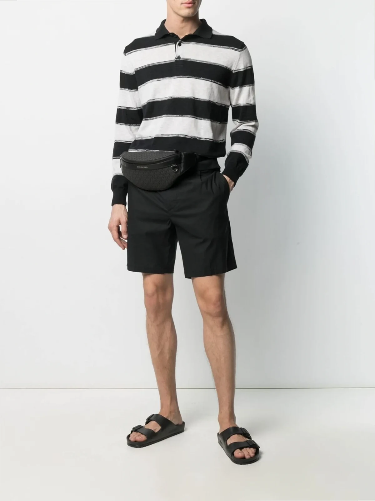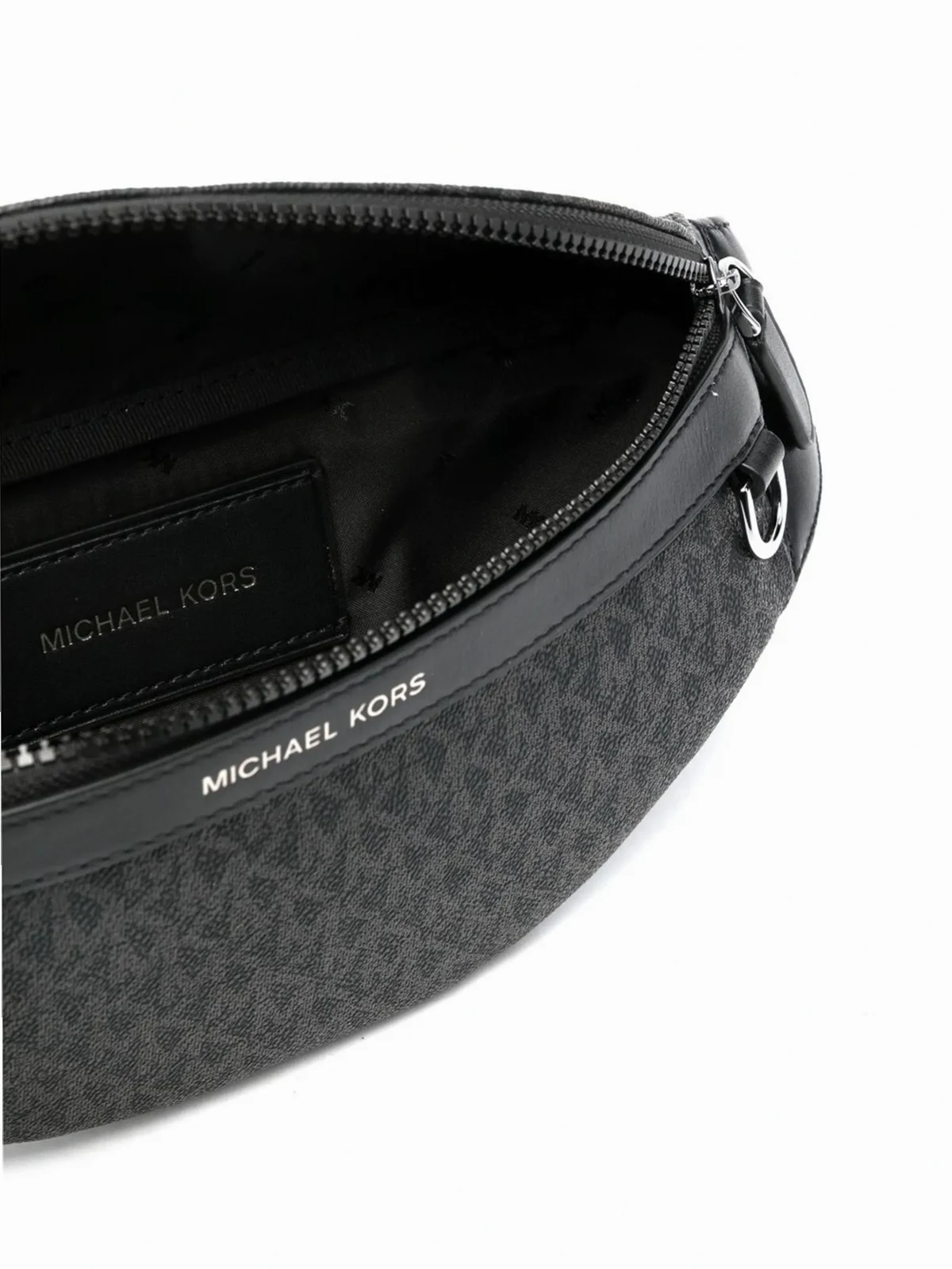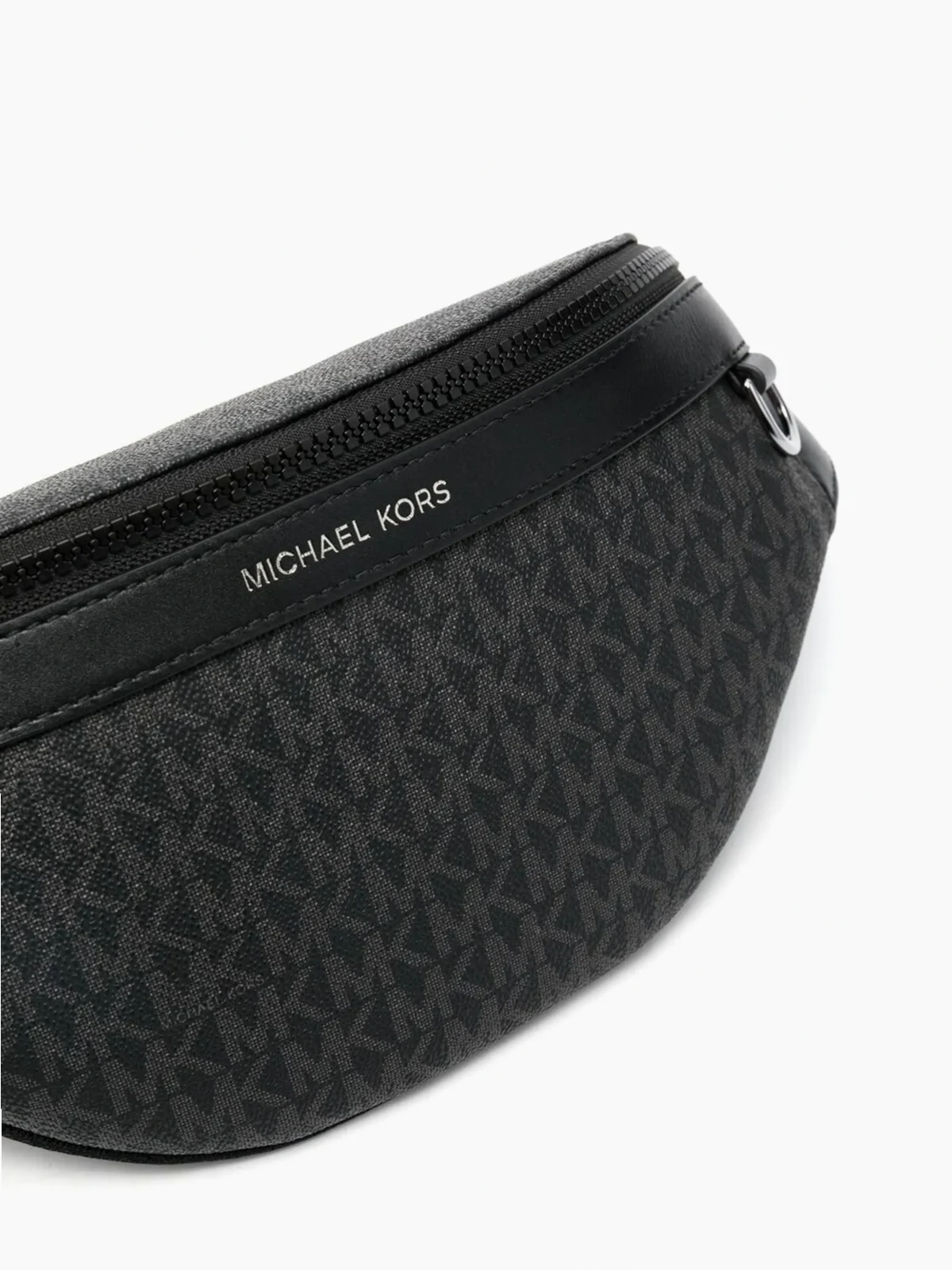 black/grey monogram pattern logo print to the front adjustable waist strap front zip fastening main compartment rear zip-fastening pocket