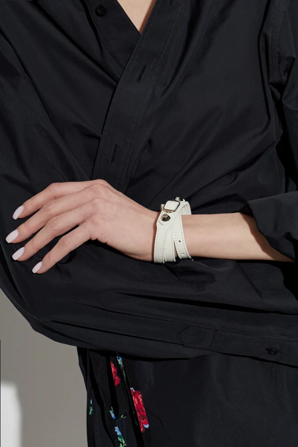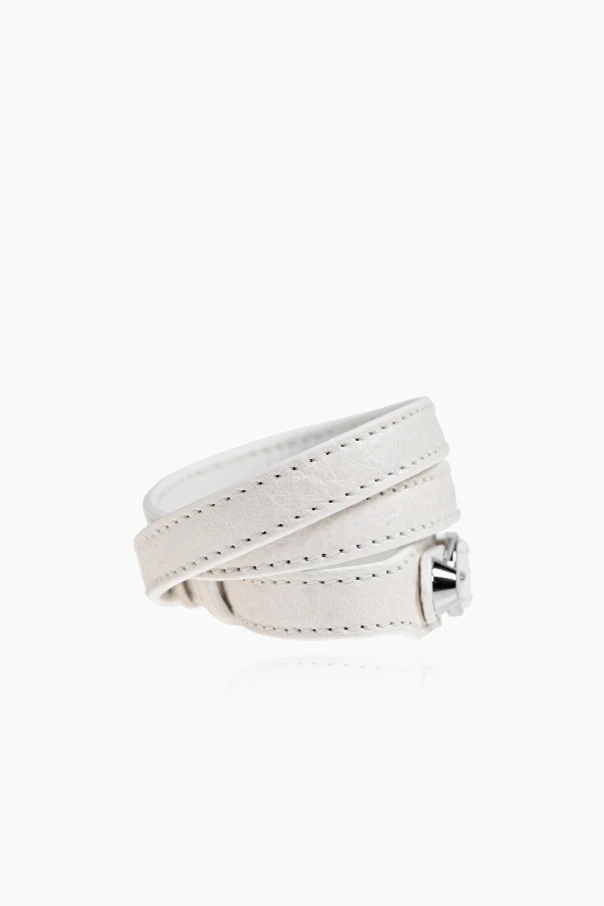 Experience refined sophistication with this white leather wrap bracelet, a quintessential accessory designed by Balenciaga . Crafted from premium leather and accented with silver-toned brass, it exudes understated elegance while offering sublime comfort. The bracelet’s slender, elongated silhouette is meticulously designed to wrap multiple times around the wrist, creating an artful layered effect.