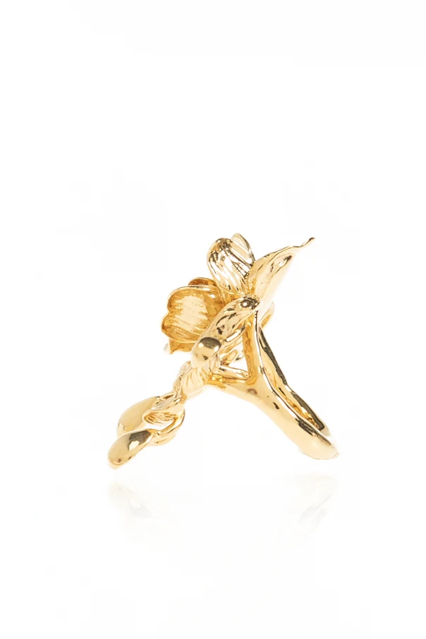 Gracefully merging artistry and bold sophistication, the Bouquet Ring by Chloé is an extraordinary statement piece. Crafted entirely of luminous gold-toned brass , this ring draws inspiration from nature’s most exquisite bouquets, presenting a striking, sculptural floral motif. Its three-dimensional petals, delicate twigs, and intricately rendered leaves evoke the beauty of a freshly gathered arrangement, casting elegant shadows and shimmering with every movement.