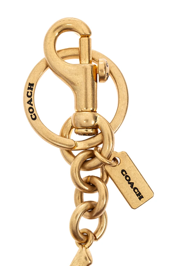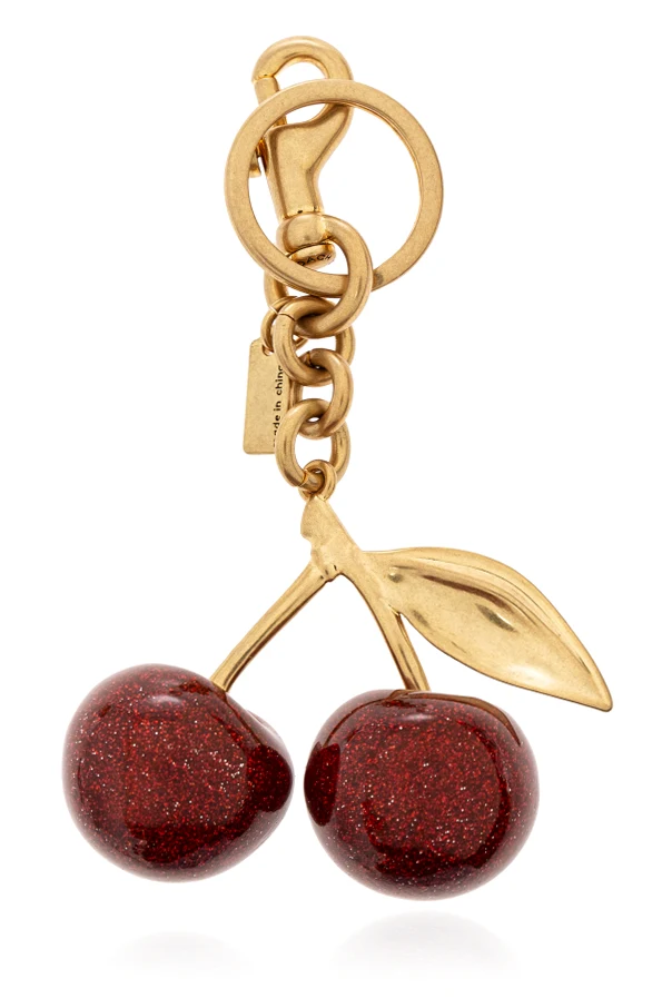 Meticulously crafted, the charm is fashioned from lustrous gold-colored metal, while the cherries boast a brilliant, glass-like sheen, epitomizing sophistication. The keychain is elegantly completed with a metal carabiner and key ring, both inscribed with the prestigious "COACH" emblem.