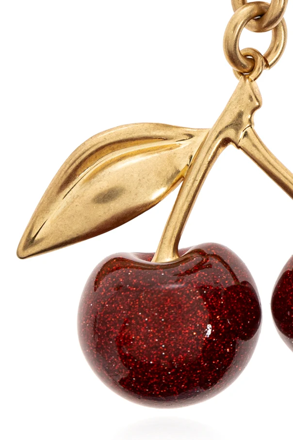 Discover the Cherry Charm Keychain , an exquisite accessory by Coach , renowned for its unparalleled craftsmanship and American flair. This opulent keychain features a captivating design of two radiant red cherries adorned with a single, resplendent gold leaf.