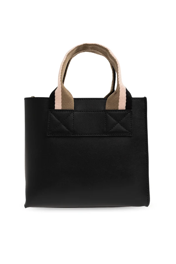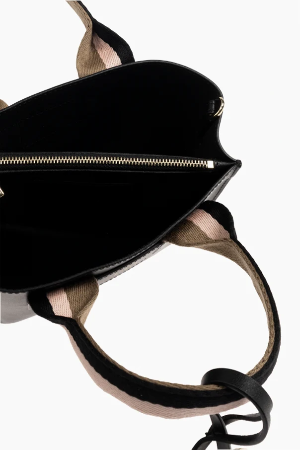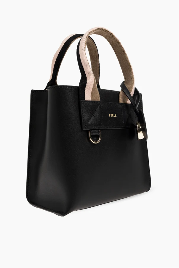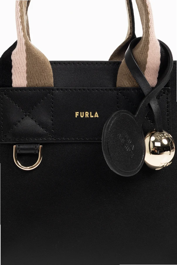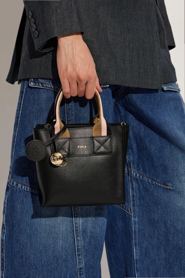 Chic beige-pink fabric handles —embellished with bold contrast “X” stitching—deliver both comfort and artistry. Adorning the front is a discreet gold Furla logo, while an elegant charm pairing a glossy gold sphere and a round black accent adds a touch of signature allure. Luminous gold-tone D-rings and snap hooks further accentuate its exclusivity.