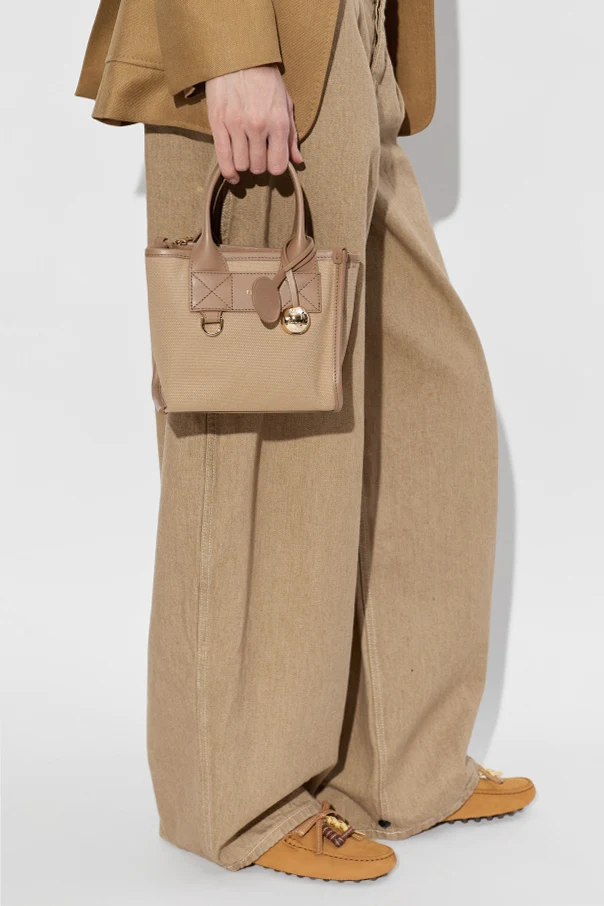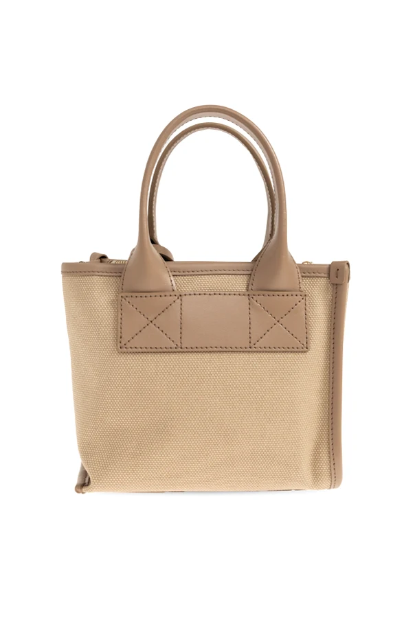 The Divide Mini handbag by Furla epitomizes understated luxury and refined sophistication. Crafted from high-quality canvas interwoven with premium leather accents, this compact mini tote boasts a subtly trapezoidal, rectangular silhouette with meticulously structured sides and base. Its smooth, pale beige surface is delicately textured, while the leather handles and trims appear in a slightly deeper shade of beige, emphasizing a tone-on-tone elegance.