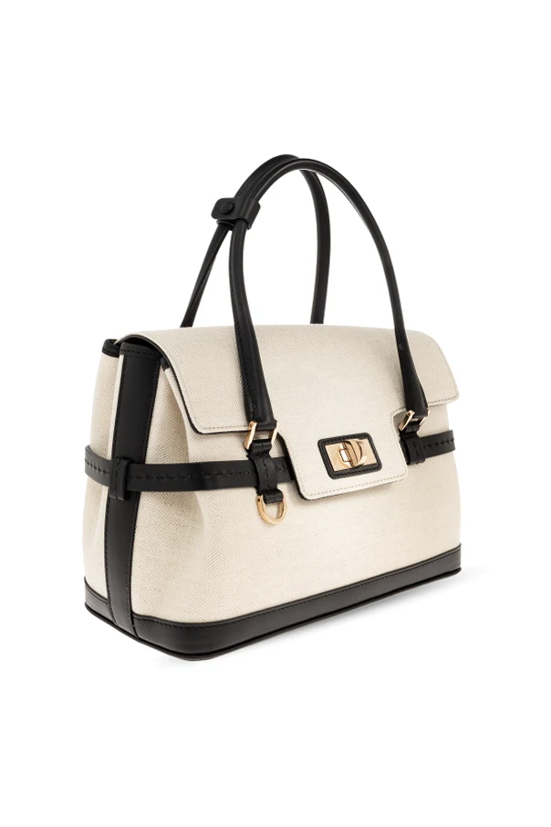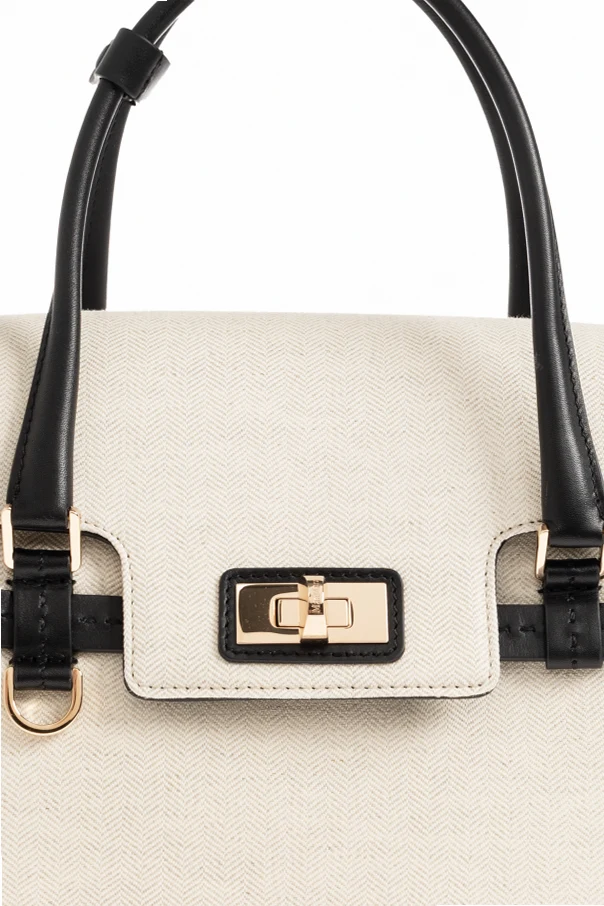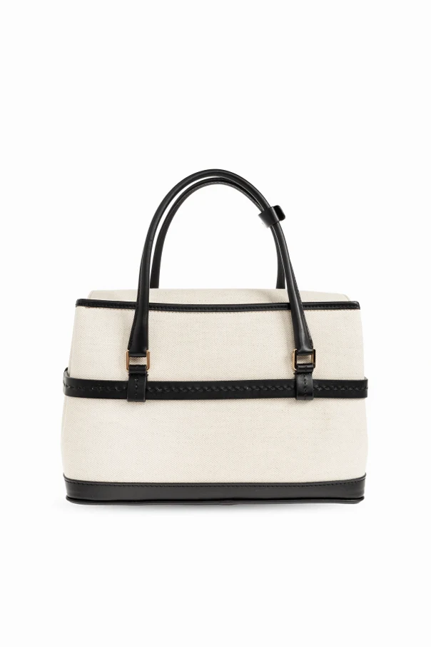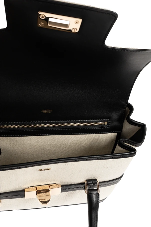 Distinctive short, rigid handles made from smooth black leather offer both comfort and style, while the gleaming gold-tone metal details impart a touch of sophistication. Meticulously executed finishing details reinforce this handbag’s exceptional craftsmanship, honoring Max Mara’s legacy of Italian luxury and sartorial innovation.