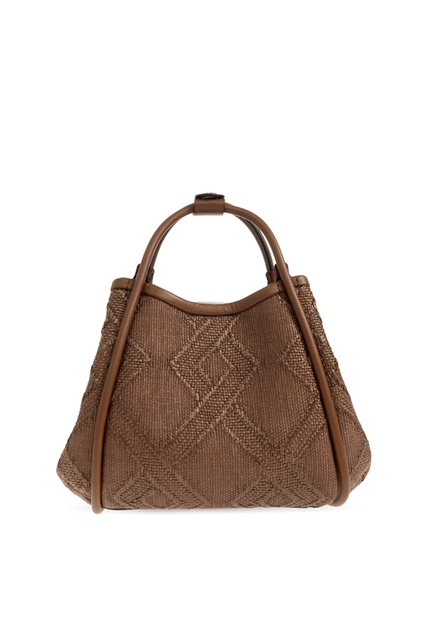 The artfully woven surface, adorned with striking diamond-inspired motifs, is meticulously fashioned from premium natural fibers and complemented by smooth leather accents and matching handles. The intricate pattern imbues the piece with unmistakable exclusivity, while the petite proportion delivers both poise and practicality for handheld elegance.