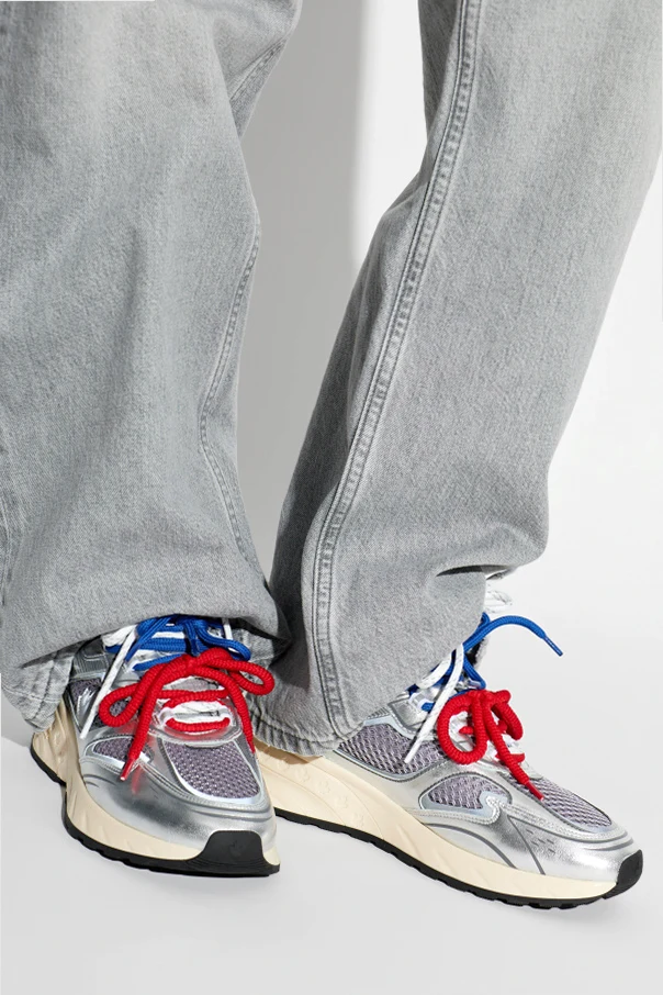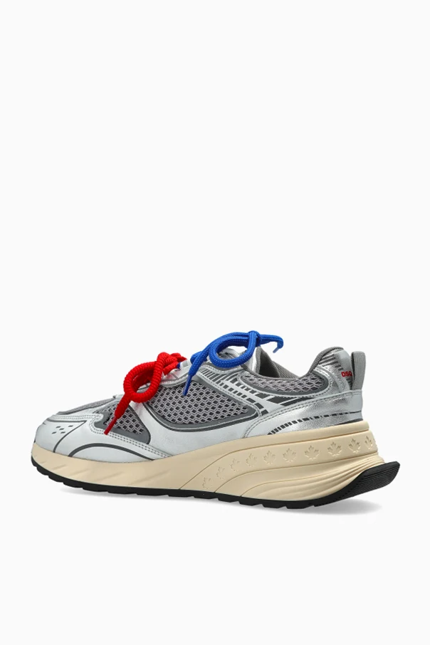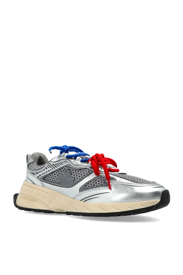 Exuding contemporary athletic allure, the Sprinter sneakers by Dsquared2 seamlessly merge innovation and sophistication. These silver low-top sneakers captivate with their sculpted silhouette—featuring a boldly contoured profile, rounded toe, and a heightened, structured heel. The upper, crafted from lustrous genuine leather and select synthetics in radiant silver, interplays impeccably with airy gray mesh panels for enhanced breathability.