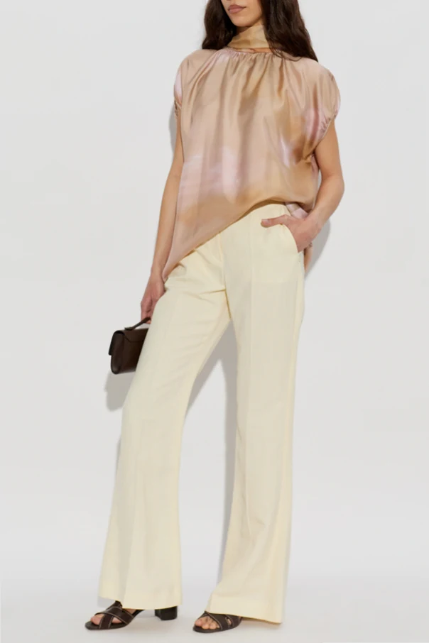 Discover timeless refinement with this silk top from the exclusive Fabiana Filippi collection. Crafted in Italy, this top captivates with its relaxed, non-restrictive silhouette, subtly dropped shoulders, and short sleeves. The elegantly ruched neckline is adorned with a high, softly structured collar and a striking bow tie detail at the nape, lending a sense of contemporary sophistication.