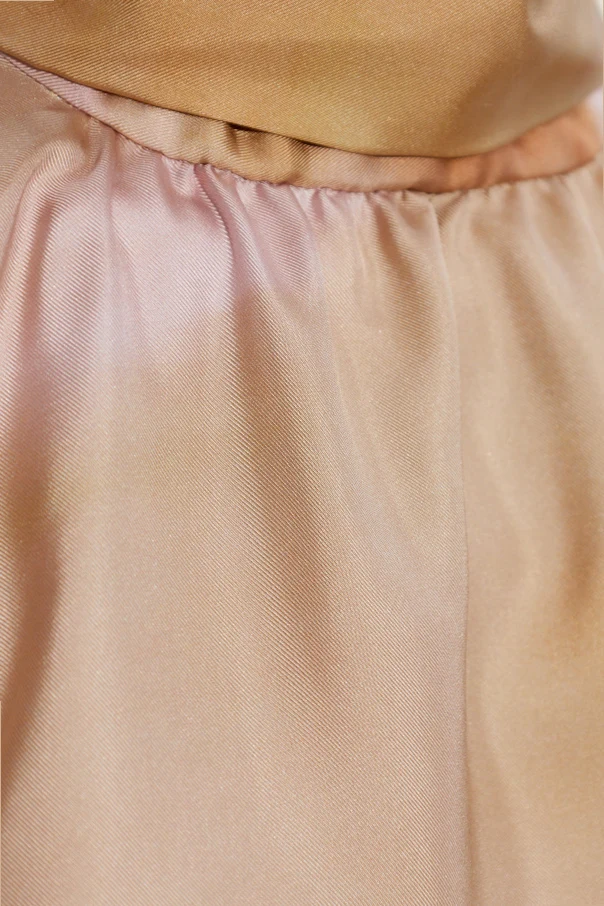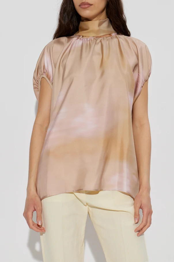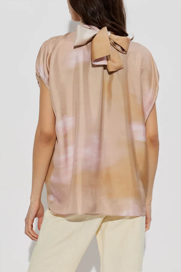 Luxurious, delicately lustrous silk imparts an exquisite softness and a gracefully fluid drape. The ethereal watercolor effect features a dominant pink hue, infused with delicate tones of beige and peach, creating a gentle, pastel ambiance. Devoid of overt branding, this top stands out through artistry in design and material excellence.