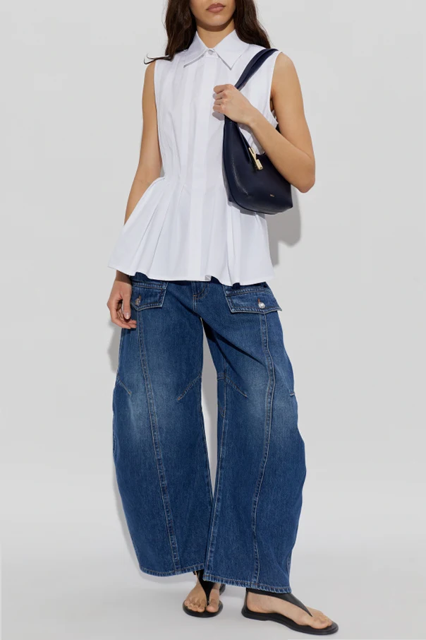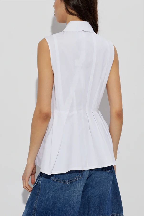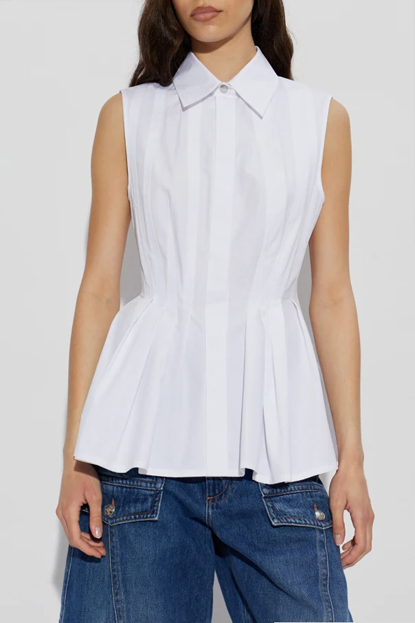 The Certosa top by SPORTMAX exemplifies refined craftsmanship and modern femininity. This sleek, sleeveless silhouette features a tailored upper bodice that seamlessly transitions into an exquisitely flared peplum hem, subtly enhancing the figure with architectural elegance. Crafted from luxurious cotton, the smooth fabric gracefully maintains its form while ensuring exceptional comfort and a polished appearance.