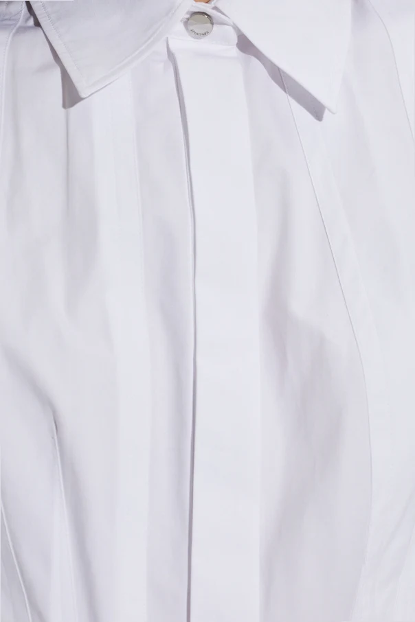 Distinctive vertical paneling on both the front and back accentuates the body's natural lines, while the classic shirt collar, fastened with a single central button, evokes timeless sophistication. Delicately structured pleats at the hem create volume, offering a uniquely sculptural and versatile look ideal for both refined daytime ensembles and understated evening occasions.