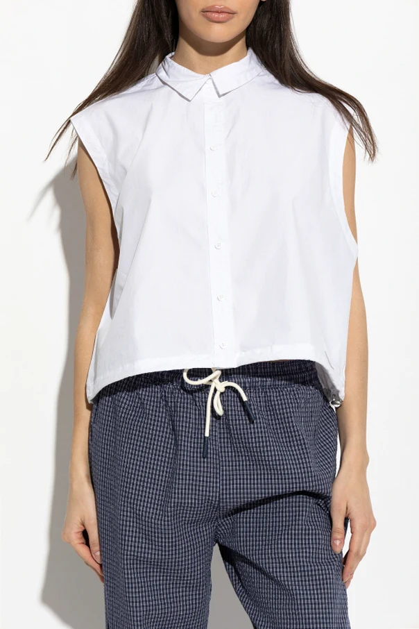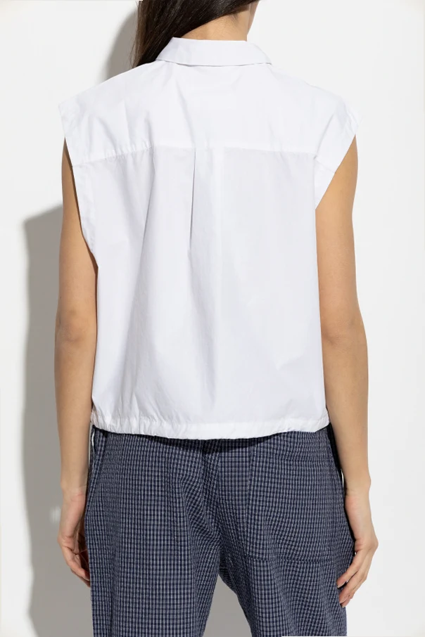 Introducing a masterfully tailored sleeveless shirt in pristine white —an embodiment of minimalist sophistication. Designed by Rethinkit Studios , this boxy, cropped silhouette gracefully skims the waist for a relaxed yet refined ensemble. The elevated, structured collar and prominent arm openings lend a distinctive geometric allure, while subtle rolled edges enhance its architectural aesthetic.