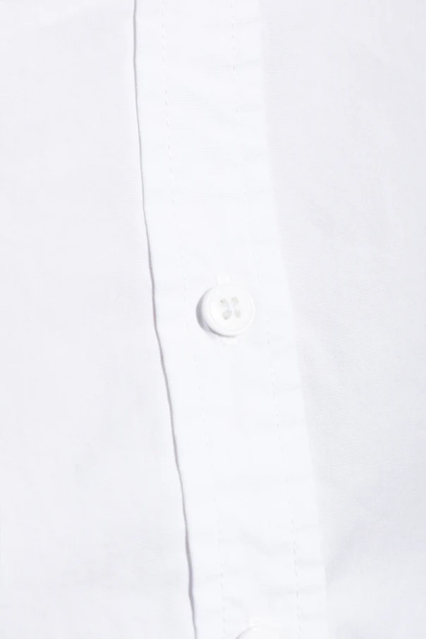 Crafted from a premium, smooth, and matte cotton, this shirt exudes discretion and elegance, resulting in both comfort and understated luxury. The crisp white button closure punctuates the front, and the absence of overt logos allows the form and fabric to take center stage. A discreet designer touch is noted at the lower hem, confirming its exclusivity.