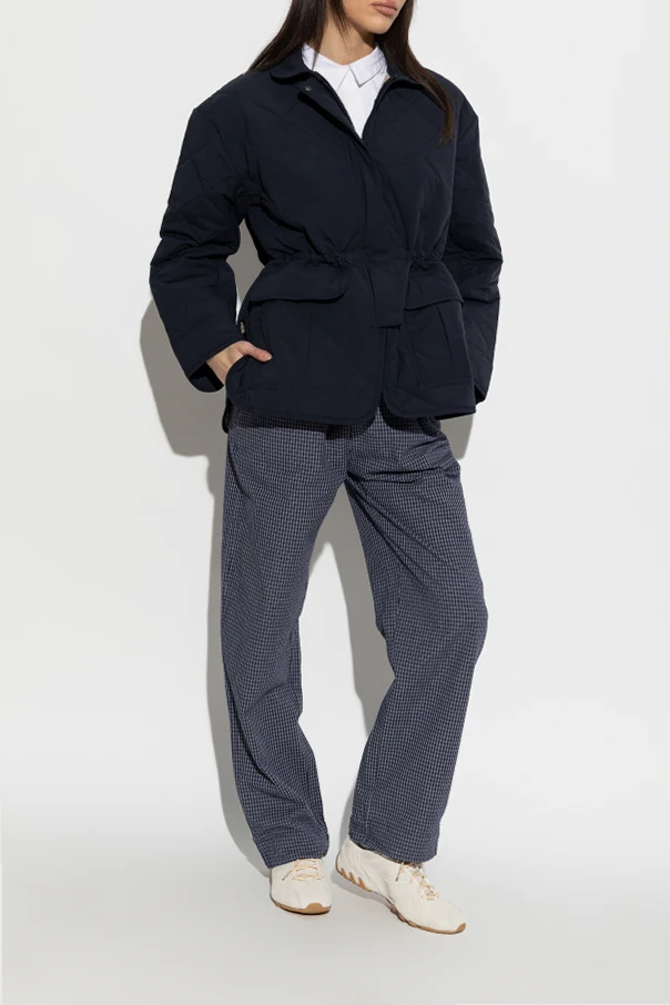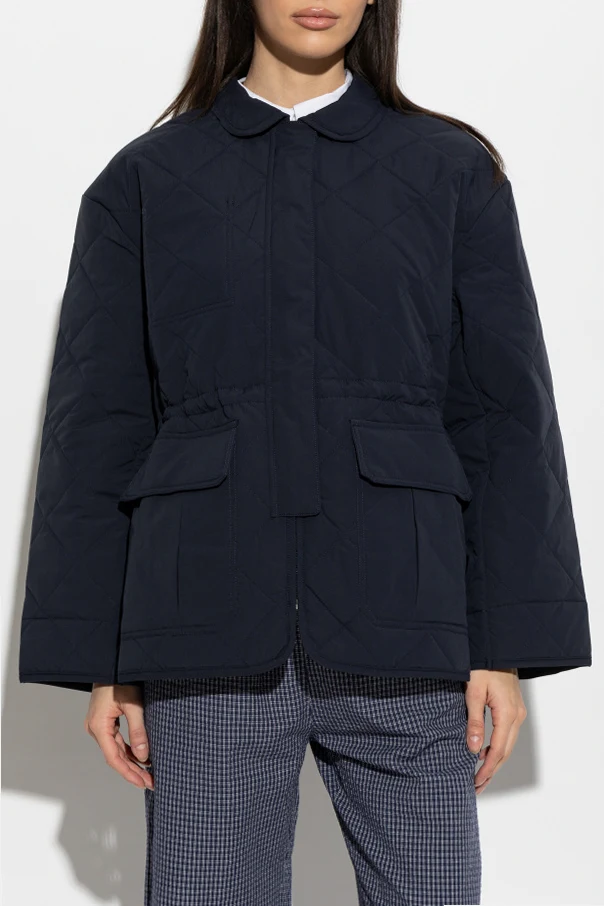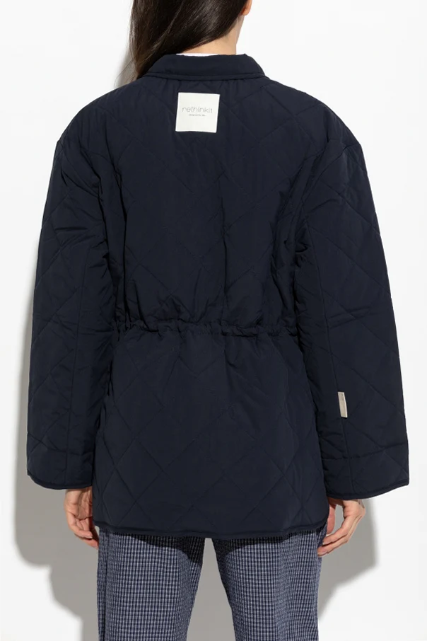 Experience refined sophistication with the Quilted Stand Collar Jacket by Rethinkit Studios, gracefully tailored in a deep navy hue. Its streamlined, subtly oversized silhouette extends below the hips, tastefully cinched at the waist with a delicate drawcord for a flattering, feminine line.