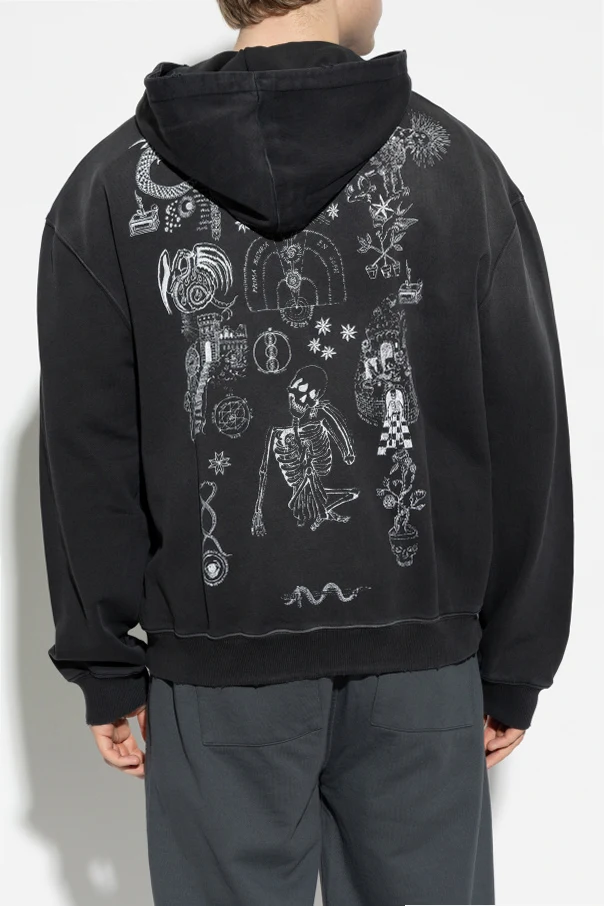 A striking silver metal zipper punctuates the front, complemented by an ample, classic hood for elevated comfort. Distinctive artistry defines this hoodie: a bold dragon print with the designer’s signature graces the left chest, while an exuberant white graphic adorns the back, uniting occult, floral, and skeletal motifs for a captivating visual narrative. Functional kangaroo pockets meld practicality with effortless style.