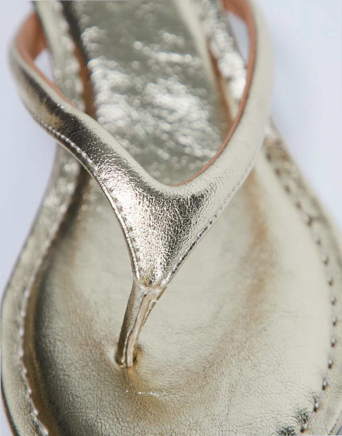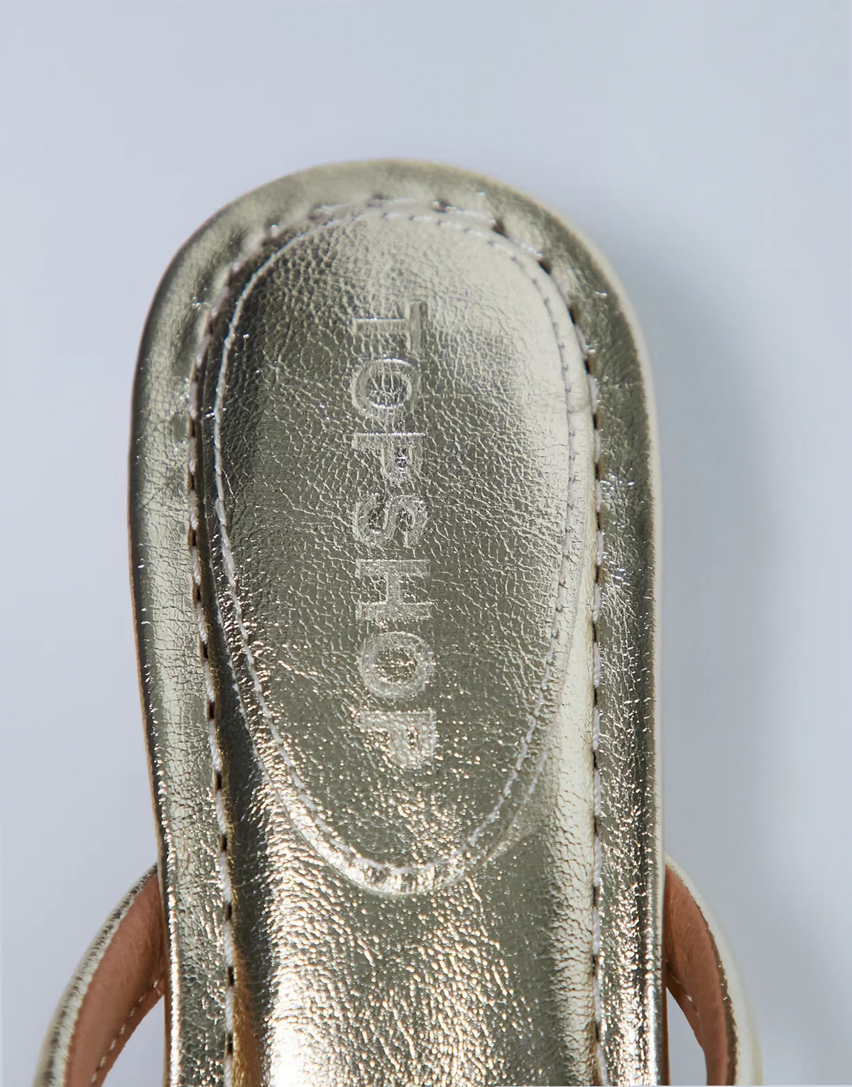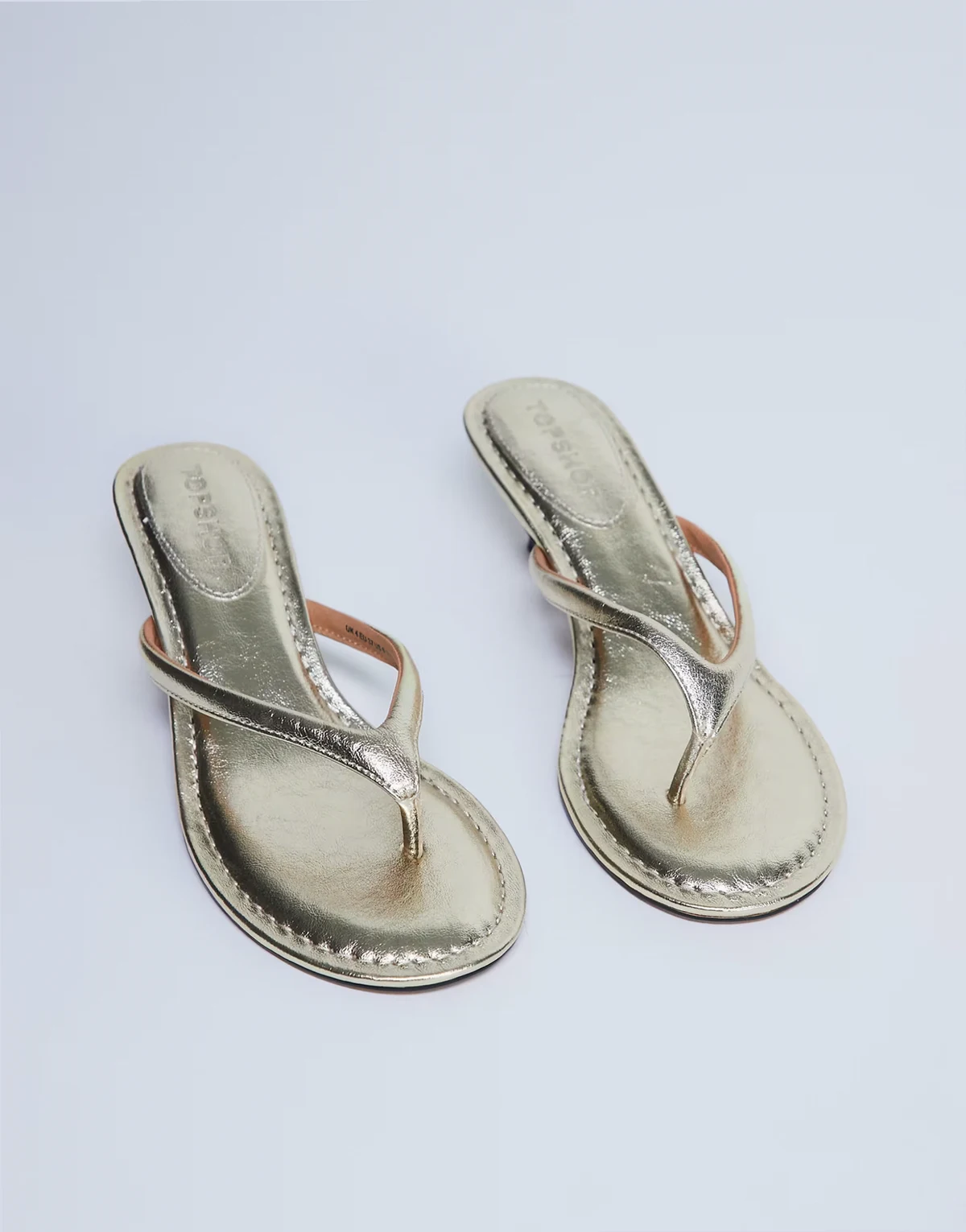In a sleek gold metallic to suit every season, these sandals feature a backless design, toe-post strap and midi heel.