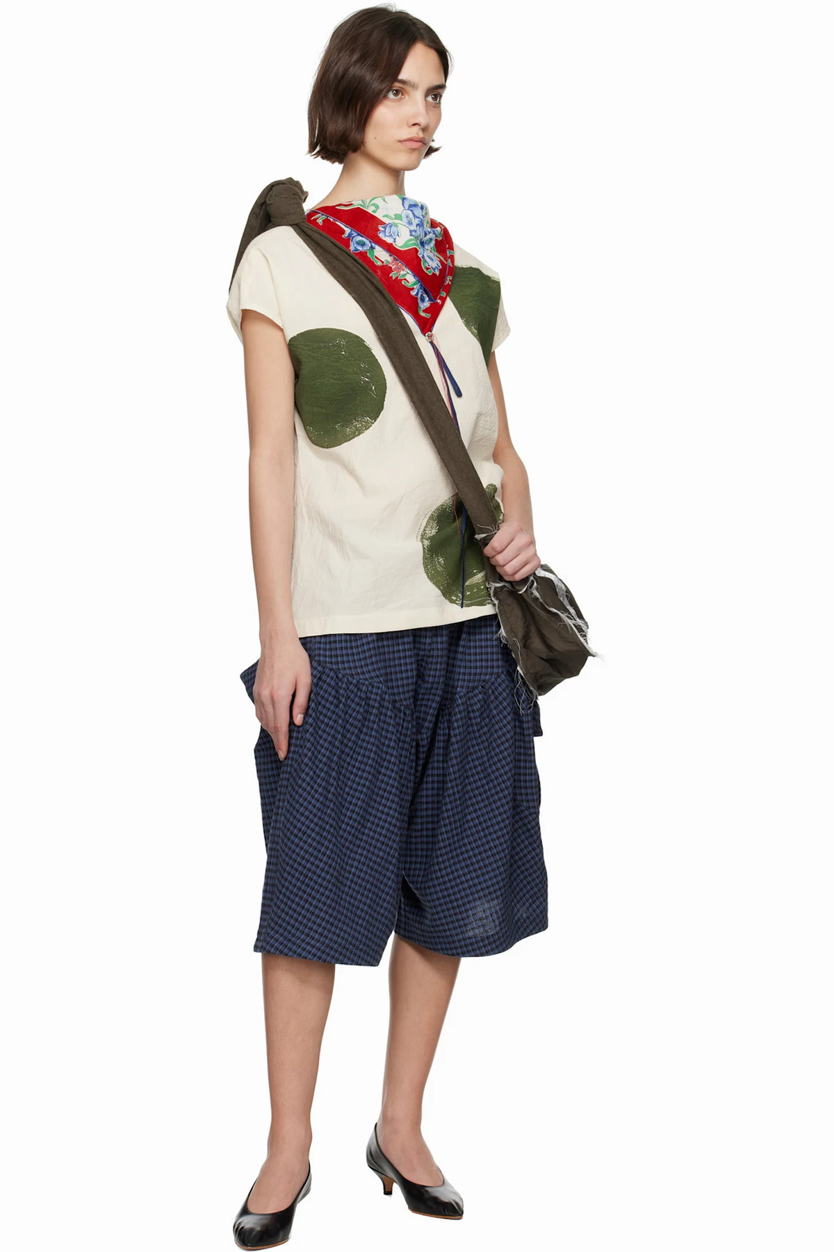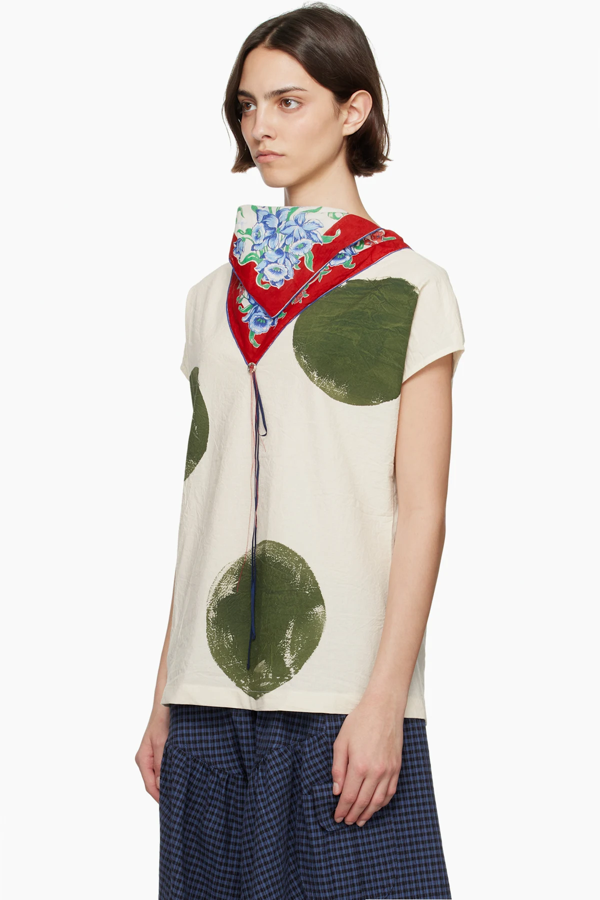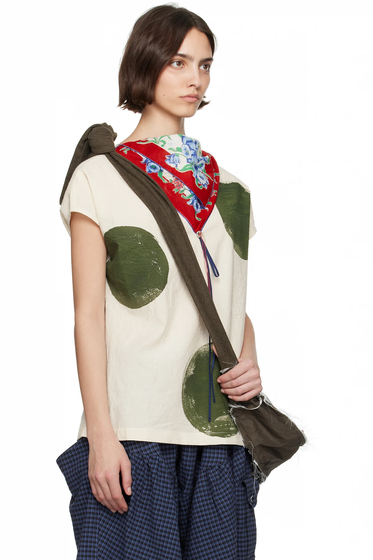 · Bandana-style panel with floral pattern at collar